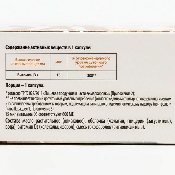 | Состав | Растительное масло (оливковое),оболочка (желатин, глицерин (загуститель), вода),витамин Д3 (холекальциферол),смесь токоферолов (антиокислитель). |