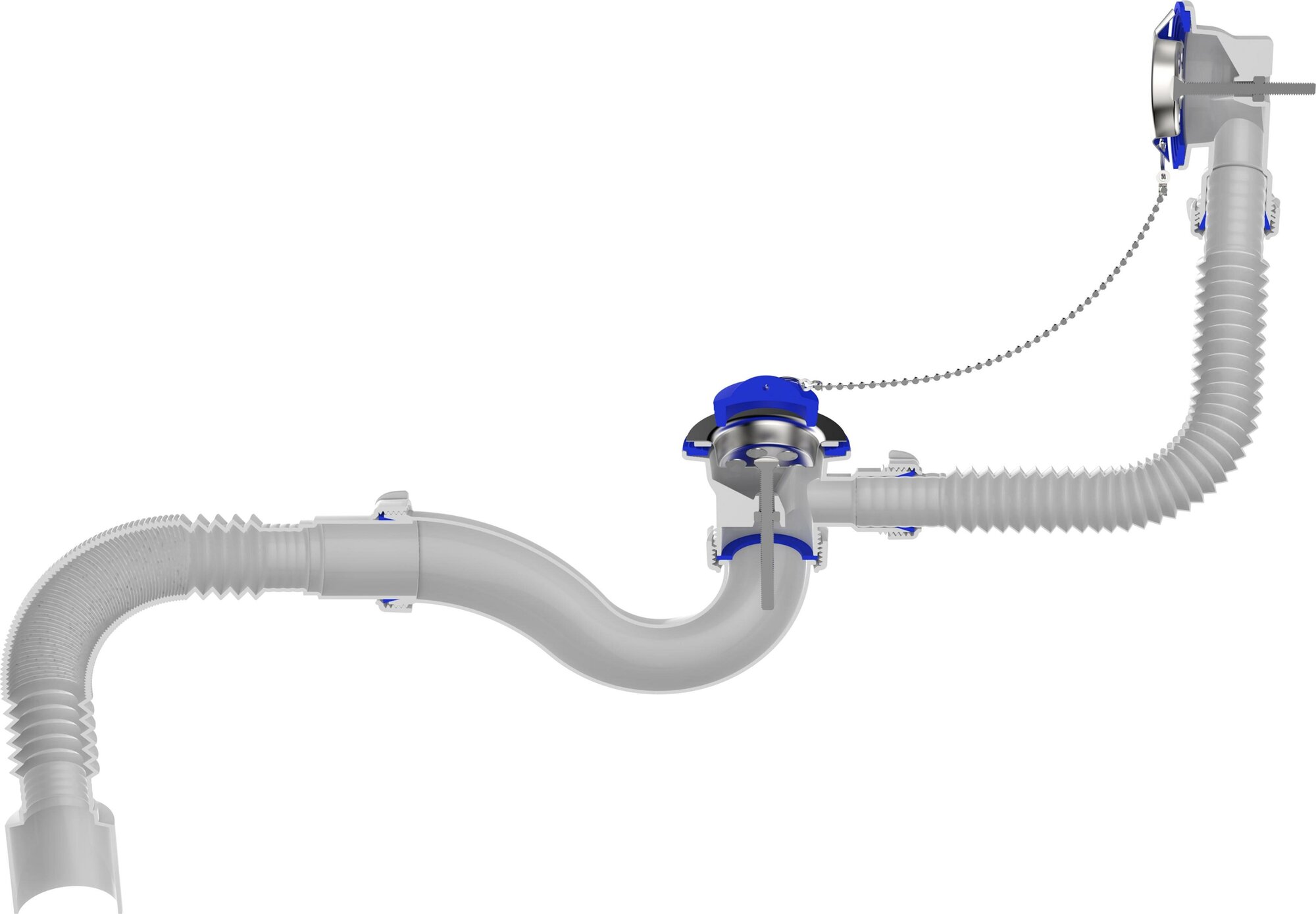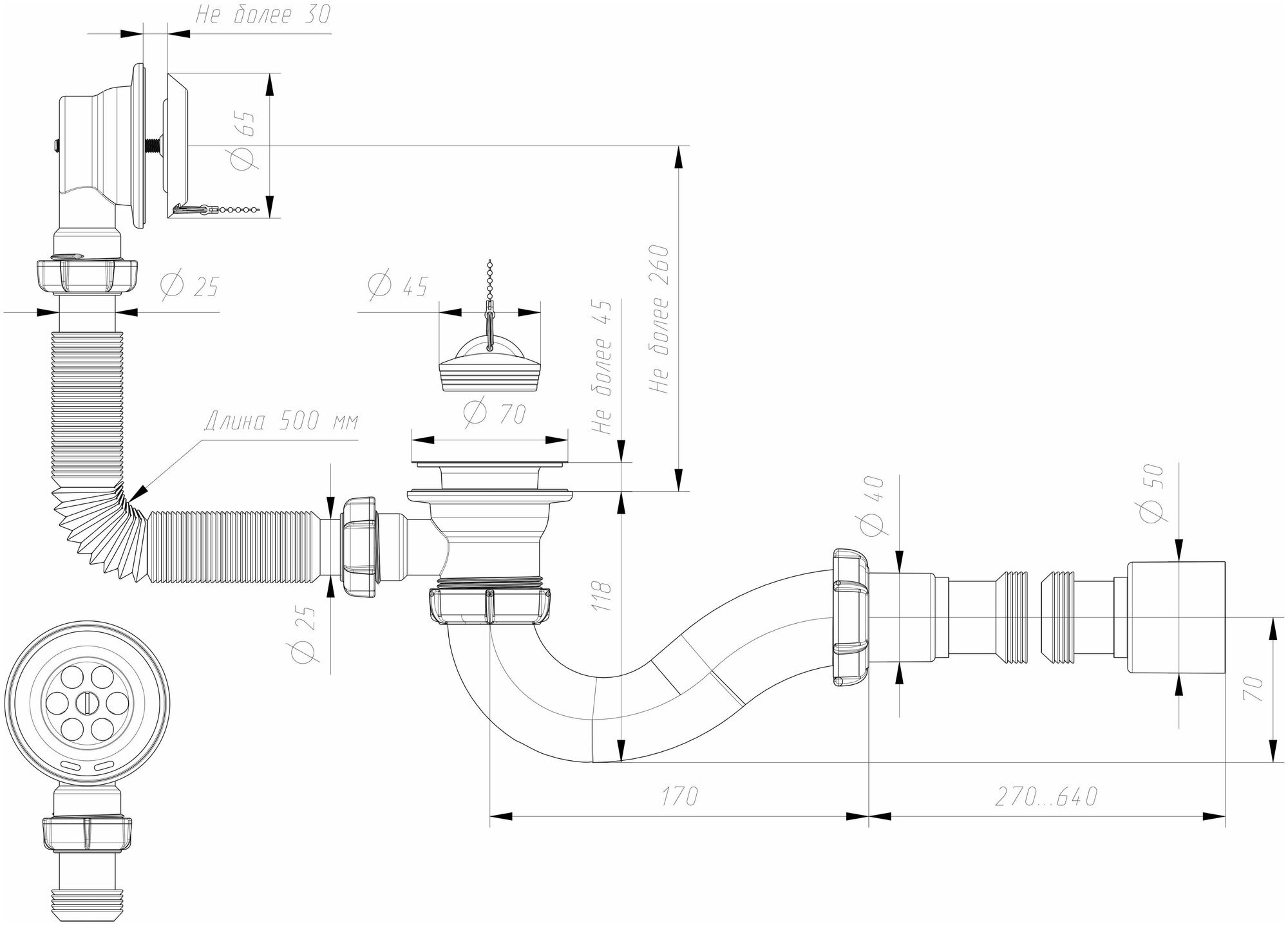 Сифон для ванны – это полноценный комплект сифона для ванны, «купил и поставил». В комплектацию входит сам сифон, стандартный перелив для ванны, цепочка и пробка, гофротруба с выходом для подключения к канализации 50мм и все переходники, прокладочные кольца, болты. Выпуск оснащен нержавеющей решеткой. Отличительная особенность сифона для ванны Aquant в минимальных габаритах, его высота всего 103 мм от нижней точки ванны, что значительно облегчает установку, при этом не сказывается на его превосходной проточности.