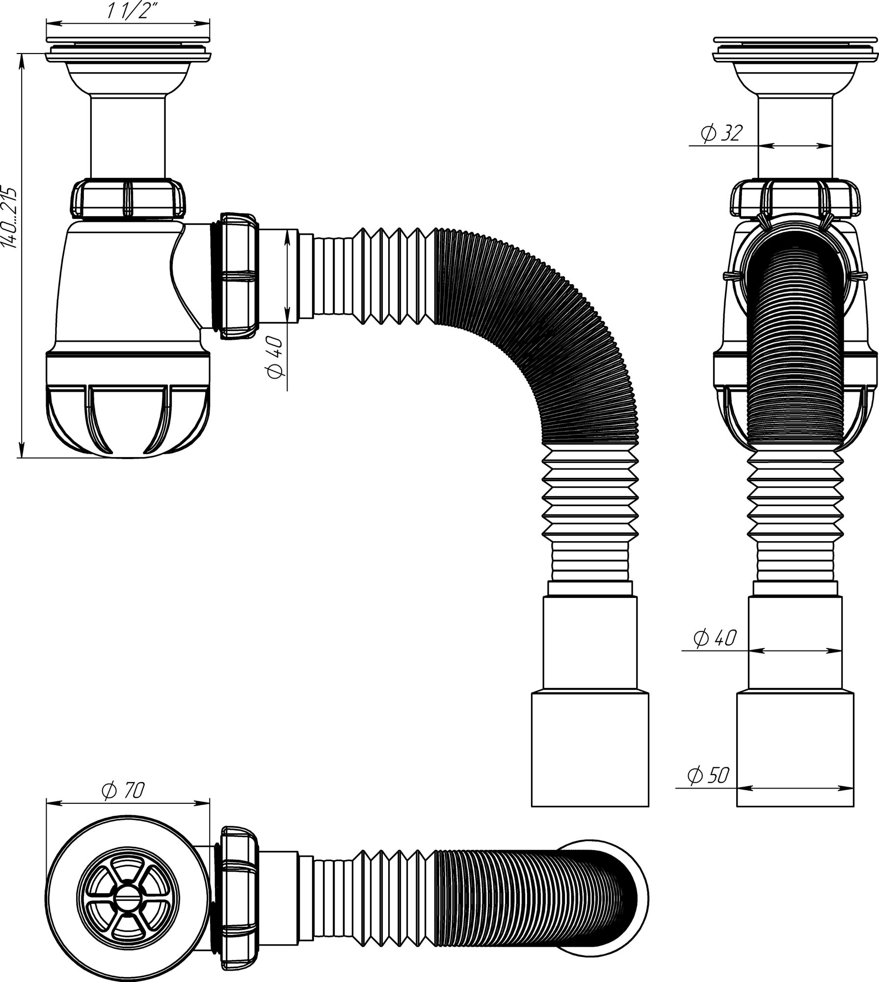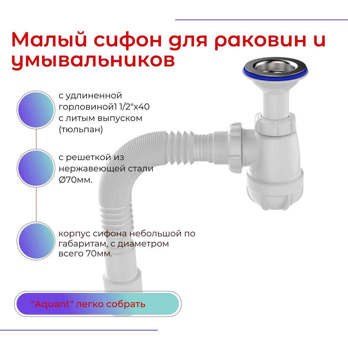 Малый сифон для умывальника бренда Aquant. Отличается удлиненной горловиной, которая идет в единой форме с выпуском 1 1/2" (70мм), диаметр выхода для подключения гофротрубы стандартный, 40 мм. Выпуск гофротрубы для подключения к канализации универсальный на два диаметра 40/50мм. На все сифоны Аквант предусмотрена Пожизненная гарантия производителя. Решетка из нержавеющей стали. Все пластиковые детали сифона производятся из высококачественного первичного полипропилена, без стирола! Сифон выдерживает перепад температур от -5 до +80 градусов. Конструкция чаши сифона имеет эксклюзивный дизайн и запатентованна патентом на промыщленный образец. Внутренняя поверхность стакана сифона с зеркальной поливовкой, что обеспечивает превосходную проточность. Прокладки изготовлены из высококачественного резины (TPE) и обеспечивают более длительный срок службы и выскую ремонтопригодность. В комплектации металлический болт для крепления длиной 60мм.