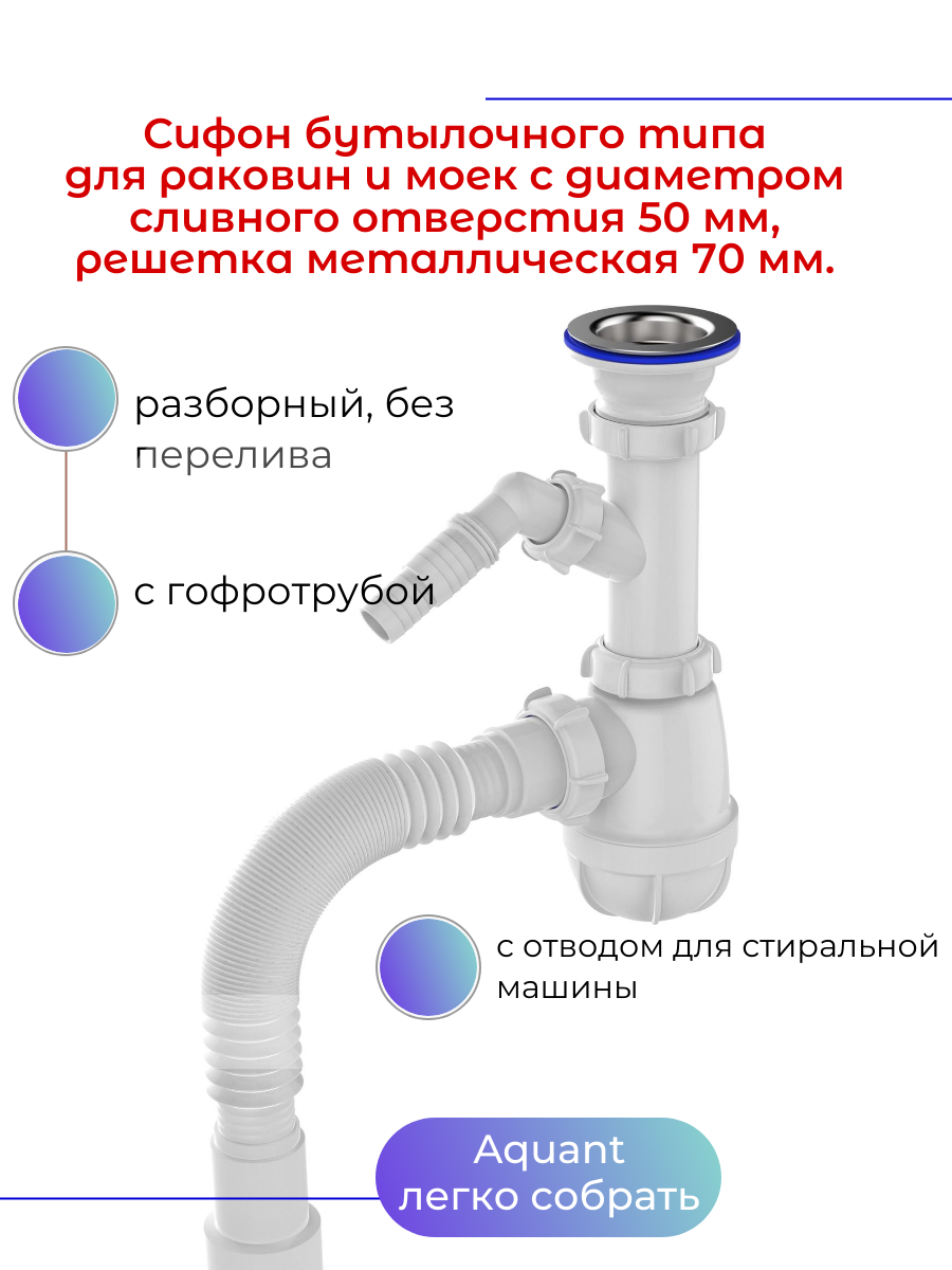 Сифон для моек AQUANT(Аквант) большой 1 1/2"*40 имеет отверстие под стиральную машину, а так же гибкую гофротрубу 40*40/50 для быстрого соединения с канализацией.