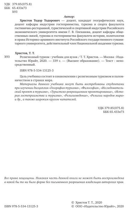 Религиозный туризм. Учебник для вузов (Тодор Тодорович Христов); ЮРАЙТ, 2020