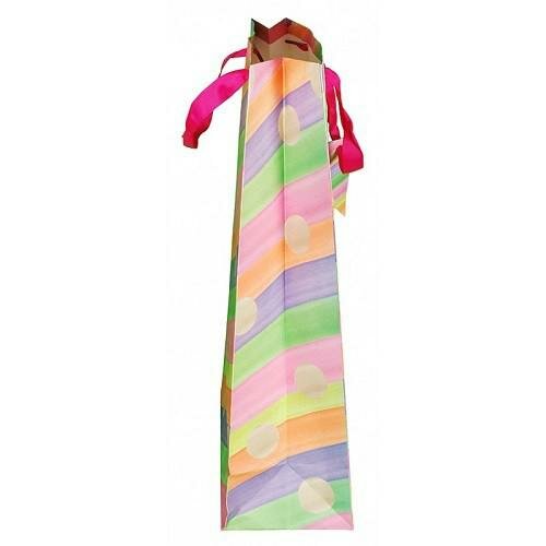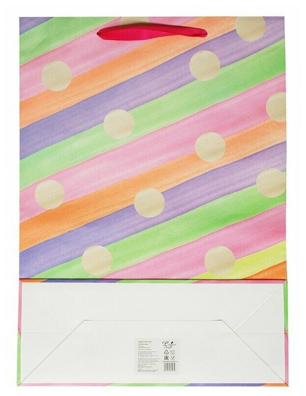Для пакетов используется высококачественная плотная бумага (210 г/м2) с хорошим качеством печати рисунка, высокая плотность бумаги позволяет изделию прекрасно сохранять первоначальную форму. В процессе использования пакеты не расклеиваются и не рвутся, в качестве ручек для пакета используется атласная лента, закрепленная стопорами с внутренней стороны пакета. Пакет дополнен бумажными подвесами на ручках.