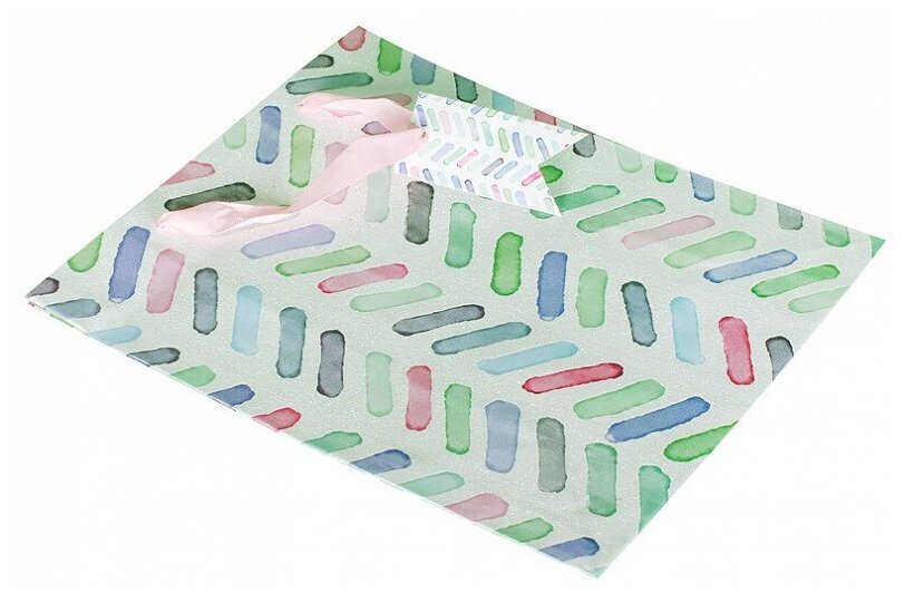 Для пакетов используется высококачественная плотная бумага (210 г/м2) с хорошим качеством печати рисунка, высокая плотность бумаги позволяет изделию прекрасно сохранять первоначальную форму. В процессе использования пакеты не расклеиваются и не рвутся, в качестве ручек для пакета используется атласная лента, закрепленная стопорами с внутренней стороны пакета. Пакет дополнен бумажными подвесами на ручках.