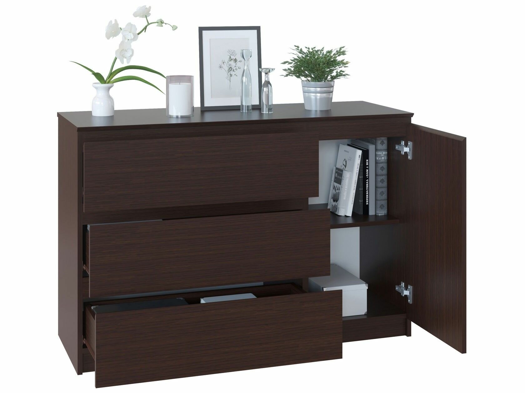 Надежная конструкция: комод изготовлен из прочного материала ЛДСП, что гарантирует его долговечность и надежность.