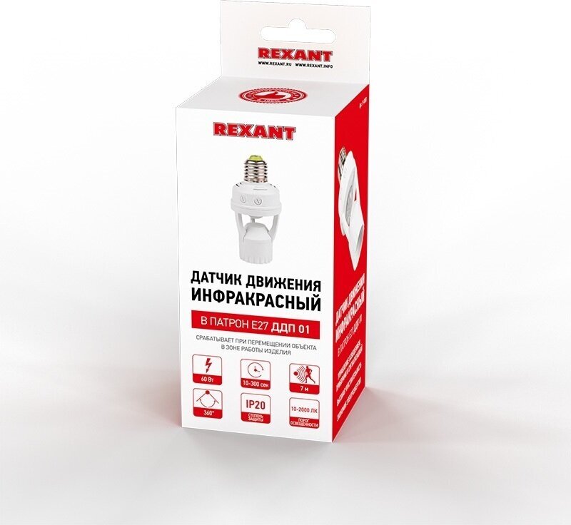 Датчик движения Rexant позволяет сделать из любого светильника со стандартным цоколем Е27 высокотехнологичный осветительный прибор. Устройство работает как насадка или переходник между цоколем и лампой. Обладает ИК датчиком движения (до 7 м, угол обзора – 360 градусов) и настройкой автоматического срабатывания при определенном уровне освещенности, например, вечером (от 10 до 2000 лк). Таймер включения отключает устройство через 10-300 сек после того, как человек покинул зону действия датчика. Все эти функции позволяют значительно экономить электроэнергию, для управления освещением не нужно нажимать на клавишу выключателя, что особенно удобно в общественных местах, в домах, где есть маленькие дети, в помещениях с длинными пролетами (лестницы, коридоры). Использование на улице только под навесом: температурный режим от -25 до +40 градусов, степень защиты IP20.