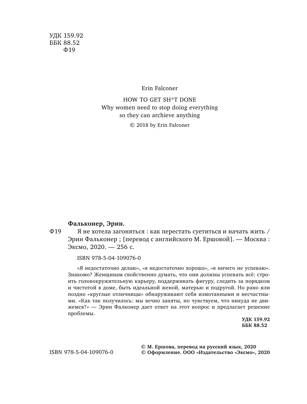 "Я недостаточно делаю", "я недостаточно хороша", "я ничего не успеваю". Знакомо? Женщинам свойственно думать, что они должны успевать всё: строить головокружительную карьеру, поддерживать фигуру, следить за порядком и чистотой в доме, быть идеальной женой, матерью и подругой. Но рано или поздно "круглые отличницы" обнаруживают себя измотанными и несчастными. "Как так получилось: мы вечно заняты, но чувствуем, что никуда не движемся?" — Эрин Фалконер дает ответ на этот вопрос и предлагает решение проблемы.