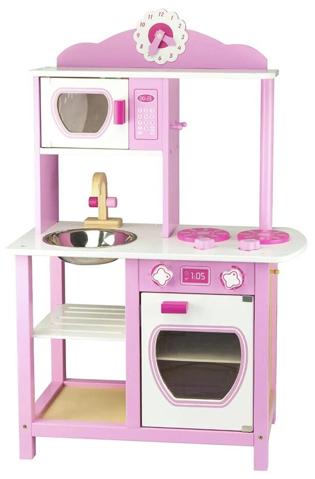 Реалистичная игровая детская кухня для девочек от 3 лет. Выполнена из натурального материала - дерева, окрашена в розовый и белый цвета, использованы безопасные красители. На микроволновой печи и духовом шкафу прозрачные окна на дверцах.Игрушечная кухня – замечательный подарок для девочек, которые любят играть в повара или хозяйку. Подходит для ролевых игр. Развивает мышление, воображение, социальные навыки. Может использоваться в центрах развития и детских садах при оформлении помещений для занятий и их зонирования, в том числе в рамках методики Монтессори (материалы, с помощью которых ребенок учится обслуживать себя).В набор входит: микроволновка, духовка, плита с двумя конфорками, ручки у плиты и духовки крутятся и трещат, раковина со смесителем (воды нет). На верху - полочка с часами, рядом с духовкой - две открытые полки.Внимание: аксессуары в комплект не входят.Размер кухни: 60х92х28 см.Материал: дерево.Цвет: розовый, белый.Рекомендованный возраст: от 3-х лет.Вес: 3000 г.