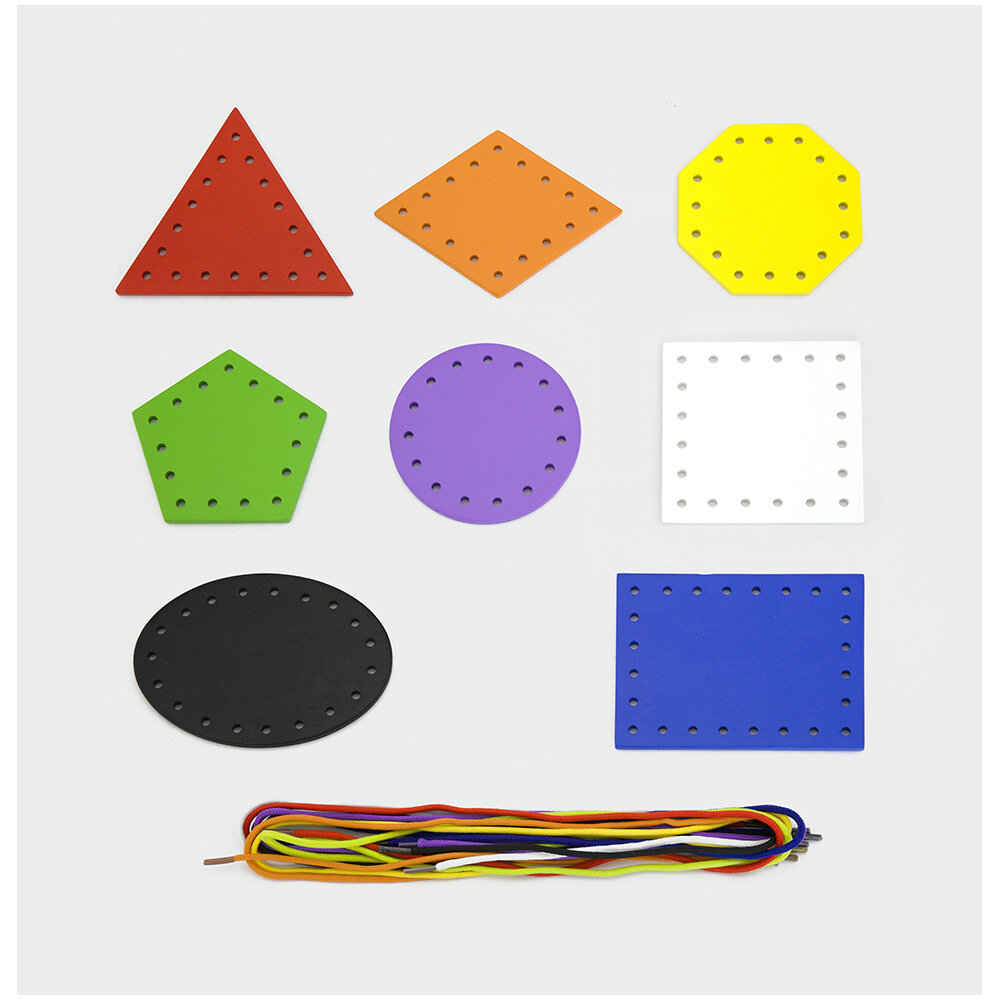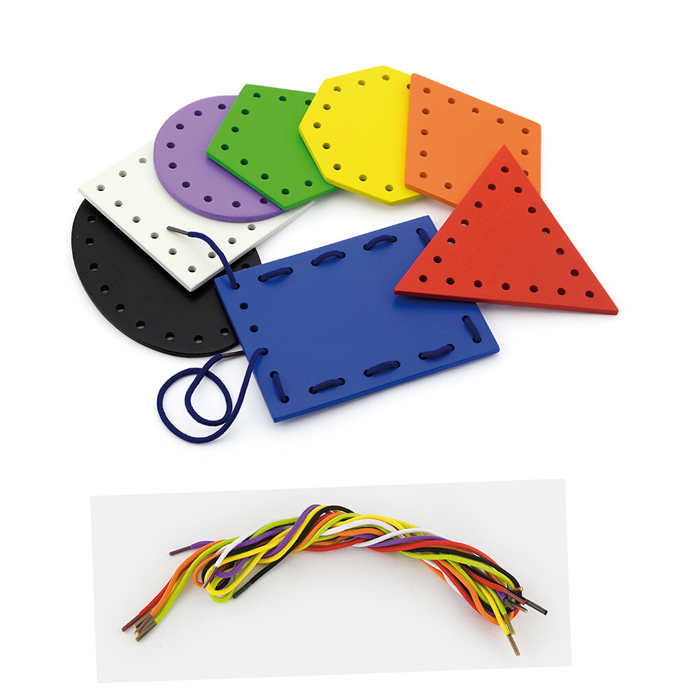Набор содержит восемь различных плоских фигур и столько же шнурков соответствующих цветов. Ребенку необходимо подобрать шнурки по цвету и продеть их в отверстия по краям форм. Игрушка способствует развитию координации рук и глаз, мелкой моторики, воображения. Ребенок также в игровой форме может узнать об основных цветах и геометрических формах.