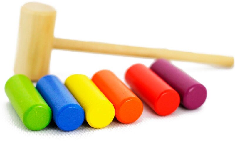Стучалка способствует развитию чувства ритма, координации движений и моторики. Ударяя по столбикам молоточком, ребенок снимает повышенную эмоциональную активность и напряжение. Кроме того, разноцветные столбики можно использовать для изучения цветов.