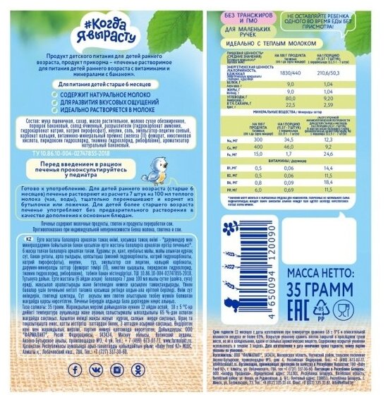 Печенье с бананом - это сбалансированный и полезный детский продукт питания или дополнительного прикорма для детей старше 6 месяцев. Разнообразные форматы печенья от мини-мини, которые так удобно держать маленькими детскими ручками, до стандартных, с забавными надписями на каждом из них, превратят процесс питания в развлечение! Печенье производится на новейшем современном заводе с соблюдением высоких требований к качеству детского питания.