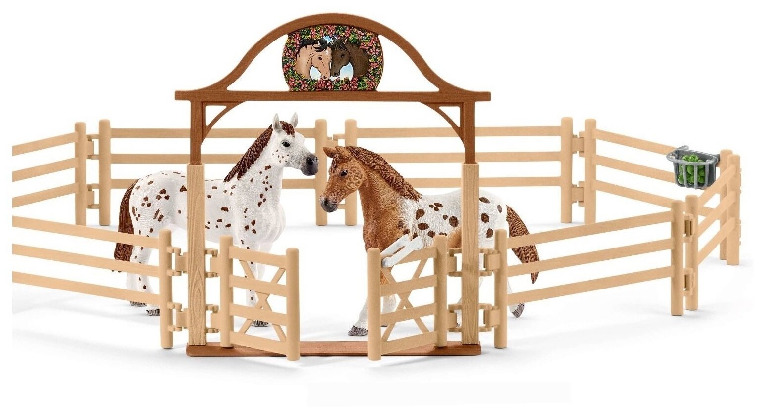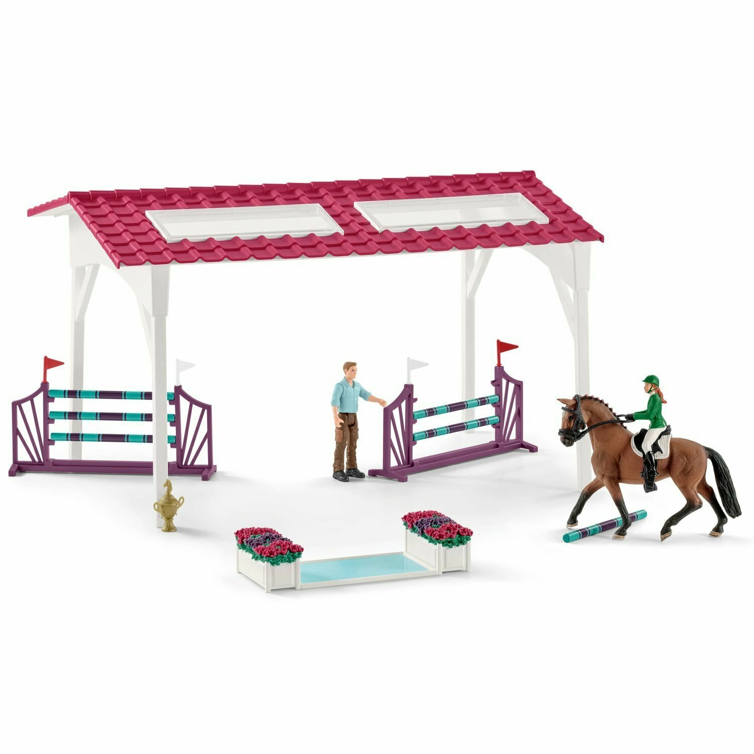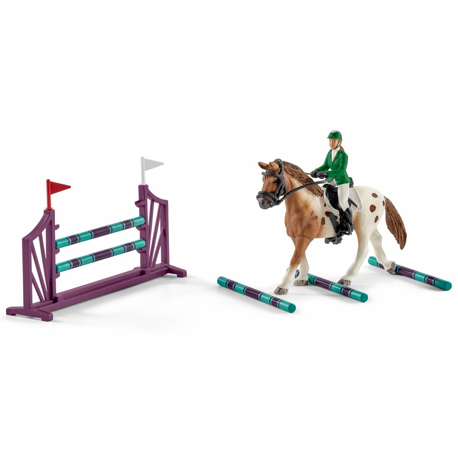 | Состав набора | Машина, ветеринар, набор ветеринара, стетоскоп, шприц, флакон с лекарством, ноутбук, рентгеновский аппарат, фиолетовый лейкопластырь, поводок, стол, стул, блокнот для выписки рецептов, 2 наклейки, крыша школы верховой езды, 12 частей для загона, ворота, наездник, инструктор по верховой езде, 2 фиолетовые вертикальные преграды, ров, трофей, английский чистокровный жеребец, Аппалузская кобыла, Аппалузский мерин, Аппалузский жеребенок, инструкция по сборке |