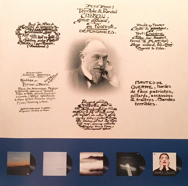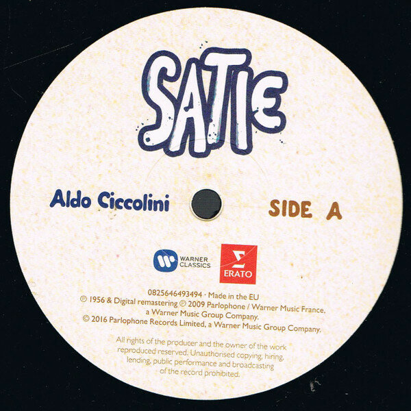 Вышедшее в 2016 году ремастированное переиздание на виниле произведений великого французского импрессиониста Эрика Сати в исполнении пианиста Альдо Чикколини. Запись была сделана в Париже в 1956 году.Творчество Эрика Сати оказало большое воздействие на музыкальную среду Франции, а позже и всего музыкального мира. Тесно связанный с ведущими французскими композиторами (РавельЮ Дебюсси), живя в эпоху импрессионизма, Сати на годы вперёд опередил мейнстрим и задал высокую планку последующим поколениям музыкантов. На данной пластинке собраны его некоторые удивительные миниатюрные произведения.Треклист: Сторона 1 Trois Morceaux En Forme de Poire Три пьесы в форме груш 1 Manière de Commencement 2 Prolongation Du Même 3 I. Lentement 4 II. Enlevé 5 III. Brutal 6 En Plus 7 RediteHeure Séculaires Et Instantanées Часы вечные и мимолётные 8 I. Obstacles Venimeux 9 Ii. Crépuscule Matinal (de Midi) 10 Iii. Affolement Granitiques (vivement)Trois Nocturnes Три ноктюрна 11 I. Doux Et Calme 12 II. Simplement 13 III. Un Peu Mouvementé Сторона 2 Trois Gymnopédies Три Гимнопедии 1 I. Lent Et Douloureux 2 Ii. Lent Et Triste 3 Iii. Lent Et Grave Les Trois Valses Distinguées Du Précieux Dégoûté Три отличных вальса Драгоценного отвращения 4 I. Sa Taille 5 II. Son Binocle 6 III. Ses Jambes Avant-Dernières Pensées Предпоследние мысли 7 I. Idylle 8 II. Aubade 9 III. MéditationTrois Gnossiennes Три Гносиены 10 I. Lent 11 II. Avec Etonnement12 III. Lent