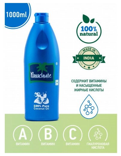 Кокосовое масло “Parachute” 100% натуральное, произведено в Индии, 1000 мл. Кокосовое масло может использоваться, как пищевых целях, так и во многих других. Кокосовое масло содержит витамины А, С, Е, природные антиоксиданты и насыщенные жирные кислоты, одна из них - гиалуроновая кислота, которая является самым сильным увлажнителем. Масло обладает защитными, смягчающими и разглаживающим действиями, что обеспечивает эффективный уход за волосами и кожей. Кокосовое масло является замечательным натуральным размягчителем, оказывает питательное, увлажняющее и противовоспалительное действие. Примечательно, что натуральное кокосовое масло - это один из лучших источников питательных веществ. Масло препятствует потере белка во время мытья. Кокосовое масло покрывает волос защитным слоем, что препятствует набуханию, а также повреждению волос при сушке полотенцем и при расчесывании, способствует росту и укреплению волос, освобождает от перхоти и восстанавливает поврежденные волосы. Питает кожу головы и препятствует выпадению волос. Аромат кокосового масла обладает релаксирующим действием, помогает снять стресс. Усталость помогут снять массажные движения, которыми желательно сопровождать нанесение кокосового масла на кожу головы. Элементы кокосового масла способствуют доставке активных веществ в глубокие слои дермы, что являет собой источник молодых клеток для регенерации кожи. Кокосовое масло очень полезно в качестве ухода за кожей лица, разглаживая кожу, предотвращает появление ранних морщинок. Масло оказывает защитное действие, спасает от пыли бактерий и вирусов. Кокосовое масло Marico хорошо показывает себя в качестве средства для получения ровного и красивого загара, защищает от солнечных ожогов. Также приятно успокаивает и увлажняет кожу после загара. Масло кокоса помогает сохранить здоровье ногтей, покрывая их защитным слоем. Как особенность кокосового масла можно выделить защиту и уход за кожей после бритья или эпиляции. Масло делает кожу более гладкой, быстро впитывается и не оставляет жирных следов. Кокосовое масло может оставаться пригодным к употреблению в течение нескольких лет, так как оно почти не вступает в реакцию с воздухом. Если вы будете хранить масло при температуре ниже +25 градусов, то из жидкого состояния масло перейдет в кремообразное, при этом не потеряет свои полезные свойства. Кокосовое масло не загрязняет поры и гипоаллергенно.