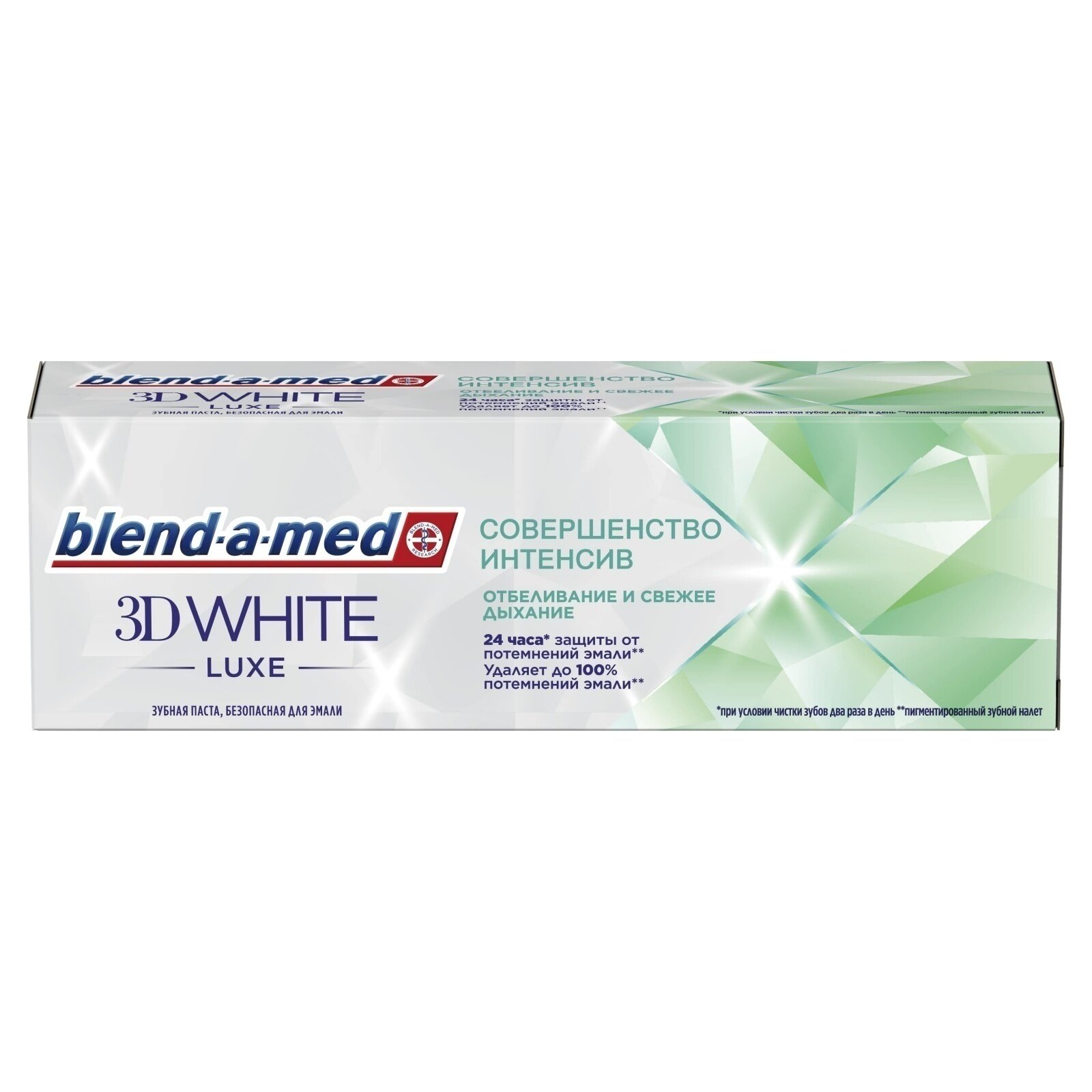 Описание товара:Восстанавливающая формула зубной пасты Blend-a-med 3D White Luxe Совершенство Интенсив активно защищает зубы от появления пигментированного налета на 24 часа (при чистке зубов дважды в день). Ее глубоко проникающая пена активно устраняет до 100 % потемнения эмали в труднодоступных местах, а питательный фтор укрепляет эмаль. Удаляет до 100 % потемнения эмали Активно защищает от потемнения эмали на 24 часа при чистке зубов дважды в день. Питательный фтор укрепляет эмаль. Свежее отбеливание и освежающий вкус мяты придают длительное ощущение свежести.Состав товара:Glycerin, Hydrated Silica, Sodium Hexametaphosphate, Aqua, PEG-6, Aroma, Trisodium Phosphate, Sodium Lauryl Sulfate, Sodium Saccharin, Carrageenan, Cocamidopropyl Betaine, Sodium Fluoride, PEG-20M, Xanthan Gum, CI 77891, Mica, Sucralose, Limonene, Sodium Benzoate, Sodium Hydroxide, Silica, Citric Acid, Sodium Citrate, Potassium Sorbate, BHT.Меры предосторожности:Не глотать. Чистите зубы в соответствии с рекомендациями Вашего стоматолога. Дети до 6 лет должны чистить зубы под наблюдением взрослых количеством пасты размером с горошину, чтобы минимизировать проглатывание. В случае применения других фторсодержащих препаратов, проконсультируйтесь со стоматологом или доктором.