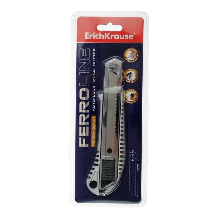 Автоматическая система фиксации лезвия "auto-lock". Полностью металлический корпус. Имеет специальную насадку для безопасного отделения сегмента лезвия, а также отверстие для подвеса. Износостойкое стальное лезвие. Упаковка: двойной блистер.