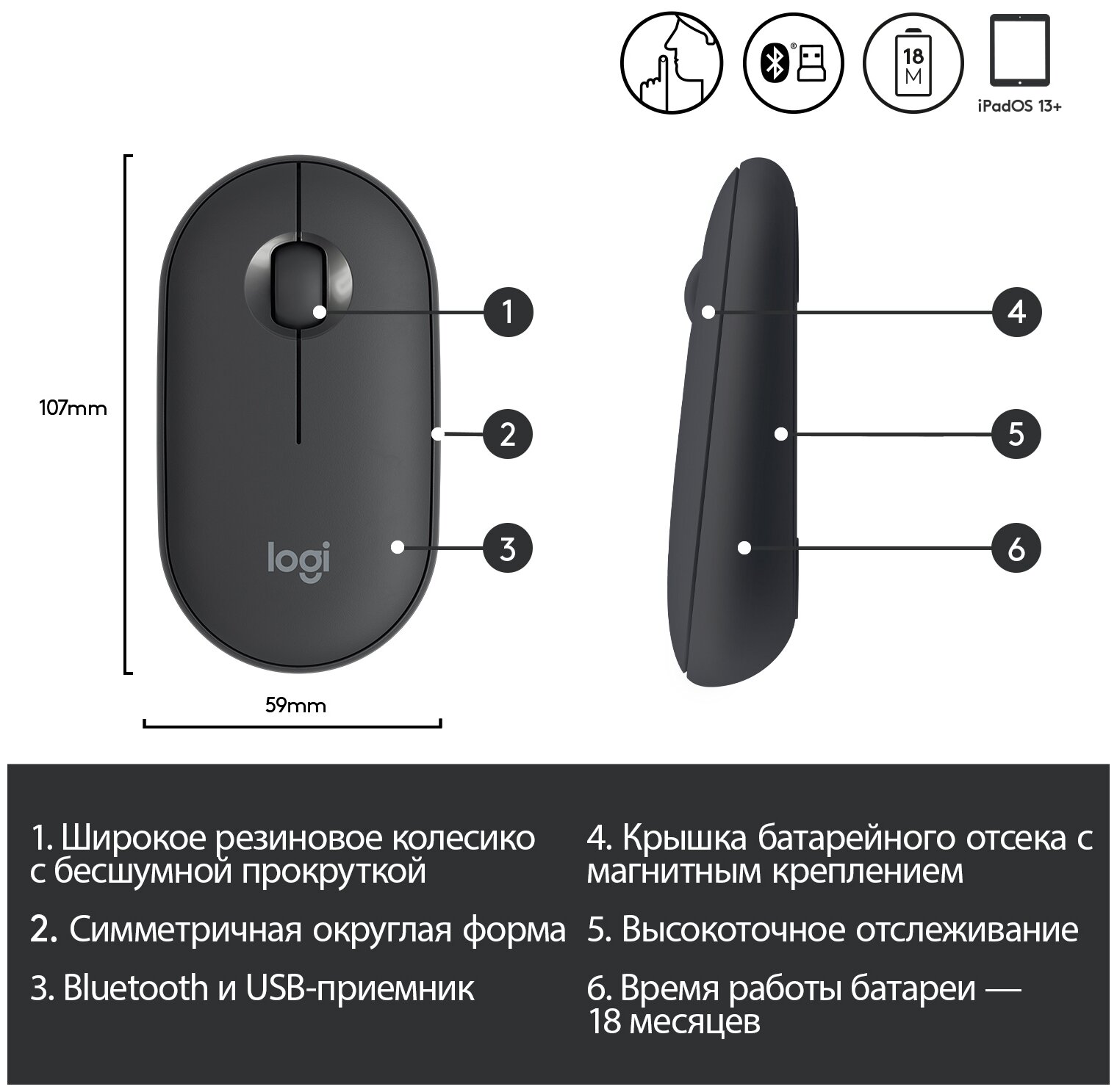 | Размеры мыши | 107 x 59 x 26.5 мм |