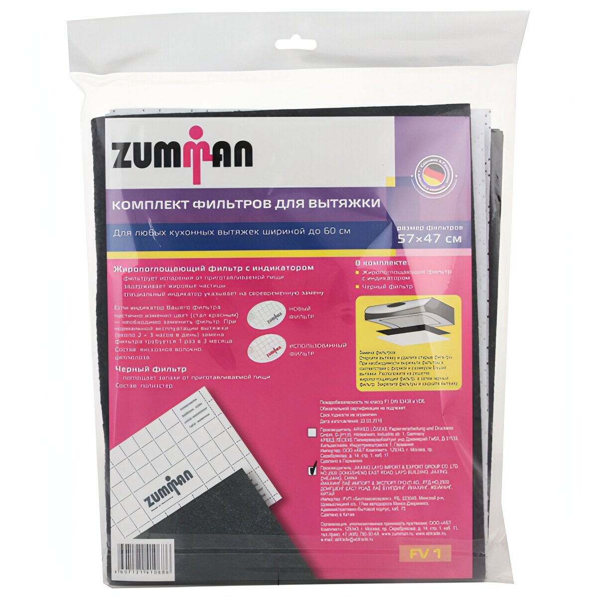 Комплект фильтров для вытяжки Zumman состоит из двух предметов: угольный фильтр и жиропоглощающий фильтр с индикатором ZUMMAN, как только индикатор изменит свой цвет с серого на красный – произведите замену фильтра. Комплект подходит к любым кухонным вытяжкам шириной 50-60 см, удаляет запахи и улавливает все жировые испарения.