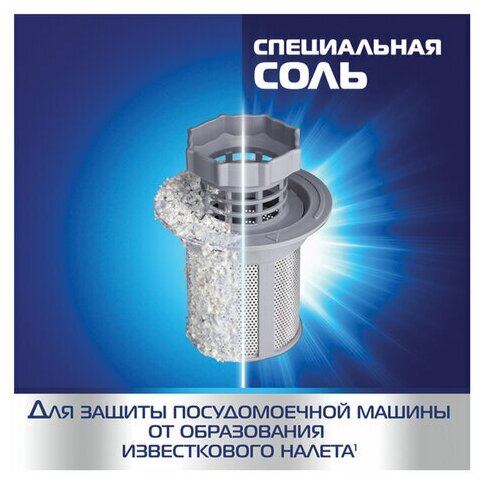 | Способ применения | Наполните солью предназначенный для нее отсек посудомоечной машины (согласно инструкции по эксплуатации). Для лучшего результата регулярно проверяйте уровень соли в отсеке, поддерживая его заполненным. Особенно рекомендуется жителям регионов с жесткой водой. |