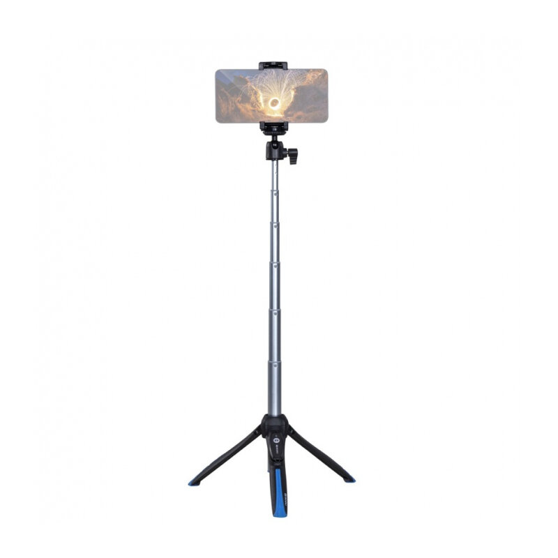 Настольный штатив с длинной центральной колонной, шаровой мини-головкой, держателем смартфона и пультом в комплекте. Когда ножки штатива сложены, они превращаются в удобную рукоятку. Штатив со сложенными ножками можно использовать как селфи-стик (селфи-палку) для сьемки смартфоном себя самого и всего, что есть вокруг.