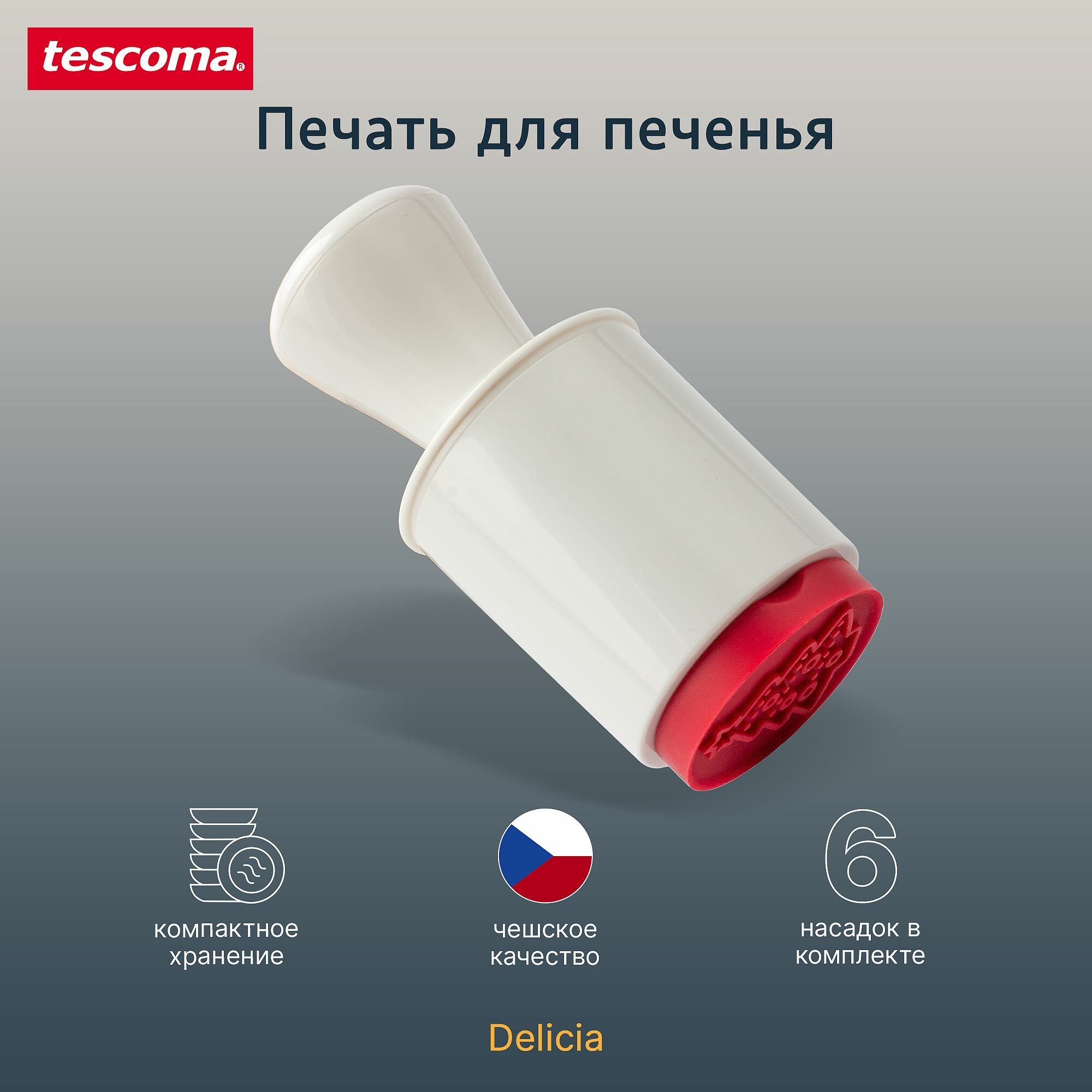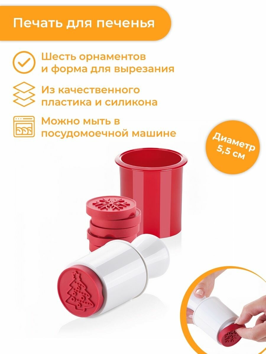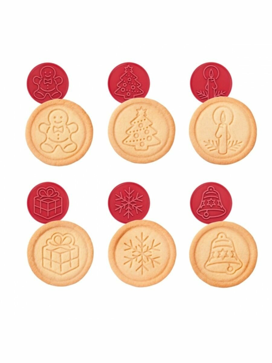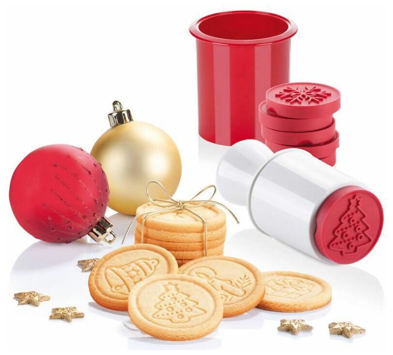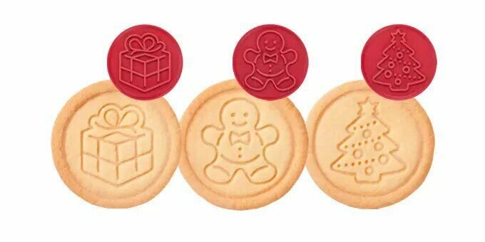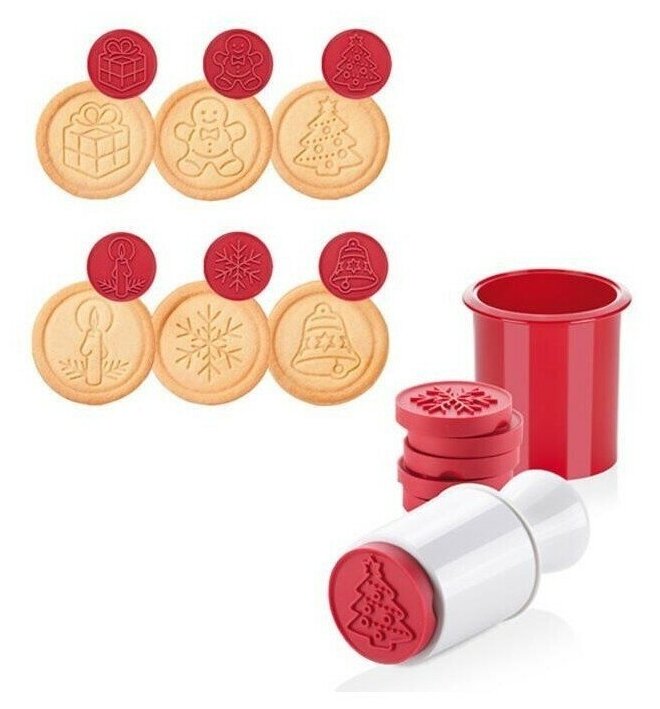 Прекрасно подходит для оригинального украшения печенья. Состоит из резиновой печати со встроенной емкостью для шести съемных печатей с рождественскими мотивами. Этот комплект позволяет сделать идеальное домашнее печенье.