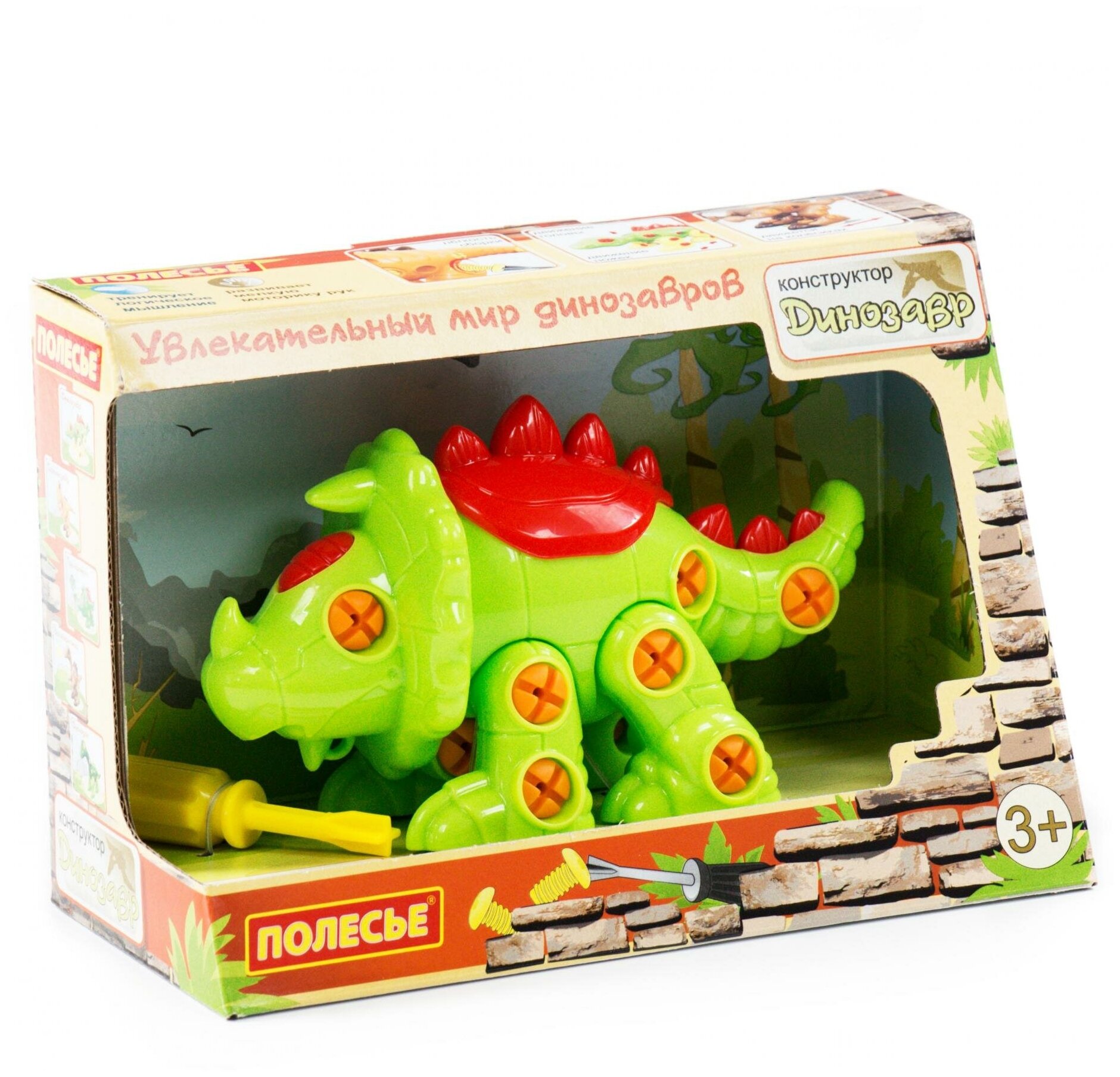 Полесье, Конструктор-динозавр "Трицератопс" (32 элемента) (в коробке), 76816Фабрика «Полесье» предлагает детям стать маленькими палеонтологами и представляет серию конструкторов в виде динозавров.Мальчики и девочки познакомятся с "Тираннозавром", "Стегозавром", "Трицератопсом", "Диплодоком", "Велоцираптором".Особенности:* Игрушка выполнена в ярких цветах, из качественного материала, имеет округлую форму.* Изготовлено из высококачественного пластика без аллергенов, токсинов и фенолов.* Все элементы представлены в виде конструктора, который соединяется с помощью пластмассовых шурупов. Ребенок может многократно разбирать игрушку и собирать её снова. Винтики вкручиваются пластмассовой отверткой (в комплекте).* Игра с таким конструктором знакомит ребёнка с древним миром животных. А также развивает фантазию, учит моделированию и конструированию.Характеристики:- Размер упаковки: 25 х 12,5 х 20 см.- Размер динозавра: 17 х 8,5 х 10,5 см.- Количество деталей: 32.- Производитель: Полесье (Беларусь).