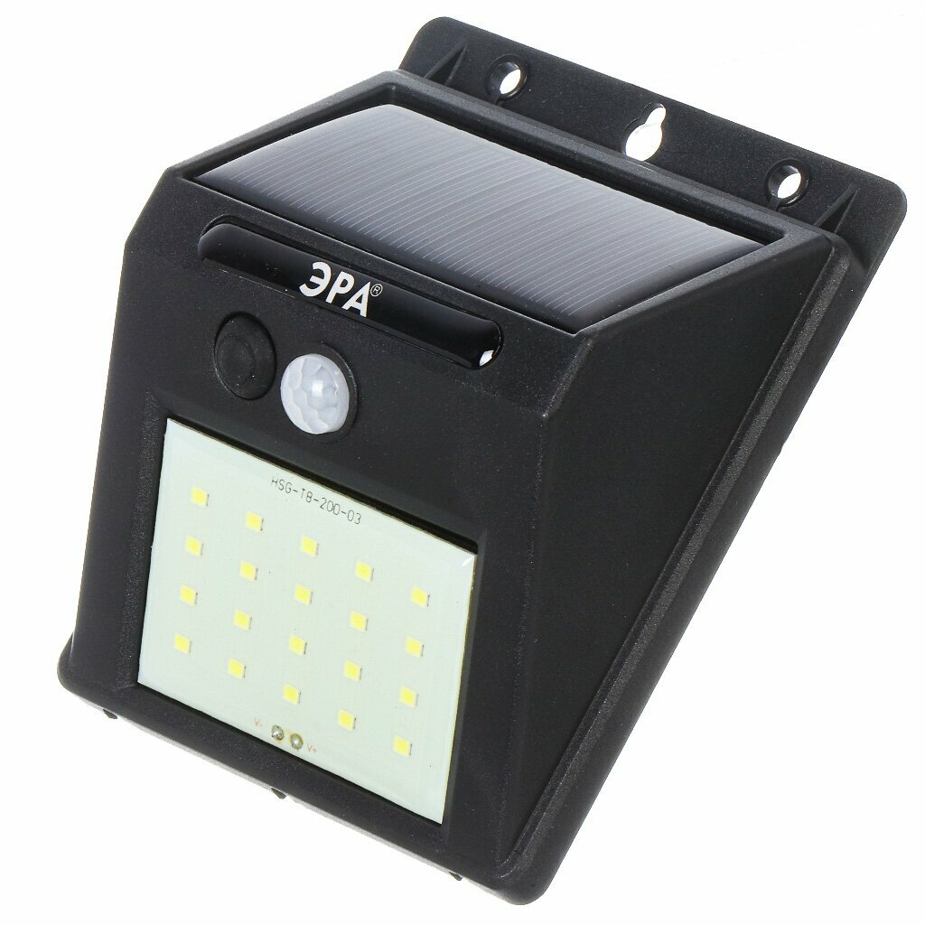 Фасадный светильник ЭРА ERAFS064-04 на солнечной батарее с датчиком движения предназначен для подсветки домов, террас, беседок, гаражей и т.д.Преимущества Имеет два режима свечения: статический и рабочий Статический режим начинает функционировать при наступлении темноты, рабочий (более яркий) - при появлении движения в радиусе 5 м Аккумулятор - 1,2 V AAA Ni-Mh Световой поток - 60 Лм