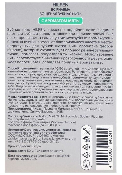 Хилфен зубная нить с ароматом мяты 50 м. Коаст Пасифик Лимитед (1092927)