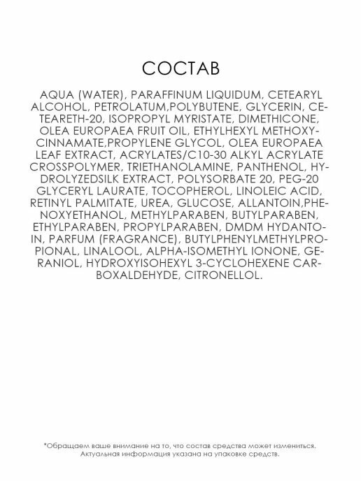 | Состав | Aqua (Water), Paraffinum Liquidum, Cetearyl Alcohol, Petrolatum, Polybutene, Glycerin, Ceteareth-20, Isopropyl Myristate, Dimethicone, Olea Europaea Fruit Oil, Ethylhexyl Methoxycinnamate, Propylene Glycol, Olea Europaea Leaf Extract, Acrylates/C10-30 Alkyl Acrylate Crosspolymer, Triethanolamine, Panthenol, Hydrolyzed Silk Extract, Polysorbate 20, PEG-20 Glyceryl Laurate, Tocopherol, Linoleic Acid, Retinyl Palmitate, Urea, Glucose, Allantoin, Phenoxyethanol, Methylparaben, Butylparaben, Ethylparaben, Propylparaben, DMDM Hydantoin, Parfum (Fragrance), Butylphenyl Methylpropional, Linalool, Alpha-Isomethyl Ionone, Geraniol, Hydroxyisohexyl 3-Cyclohexene Carboxaldehyde, Citronellol |