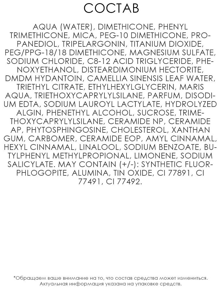 | Состав | Aqua (Water), Dimethicone, Phenyl Trimethicone, Mica, PEG-10 Dimethicone, Propanediol, Tripelargonin, Titanium Dioxide, PEG/PPG-18/18 Dimethicone, Magnesium Sulfate, Sodium Chloride, C8-12 Acid Triglyceride, Phenoxyethanol, Disteardimonium Hectorite, DMDM Hydantoin, Camellia Sinensis Leaf Water, Triethyl Citrate, Ethylhexylglycerin, Maris Aqua, Triethoxycaprylylsilane, Parfum, Disodium EDTA, Sodium Lauroyl Lactylate, Hydrolyzed Algin, Phenethyl Alcohol, Sucrose, Trimethoxycaprylylsilane, Ceramide NP, Ceramide AP, Phytosphingosine, Cholesterol, Xanthan Gum, Carbomer, Ceramide EOP, Amyl Cinnamal, Hexyl Cinnamal, Linalool, Sodium Benzoate, Butylphenyl Methylpropional, Limonene, Sodium Salicylate. May contain (+/-) |