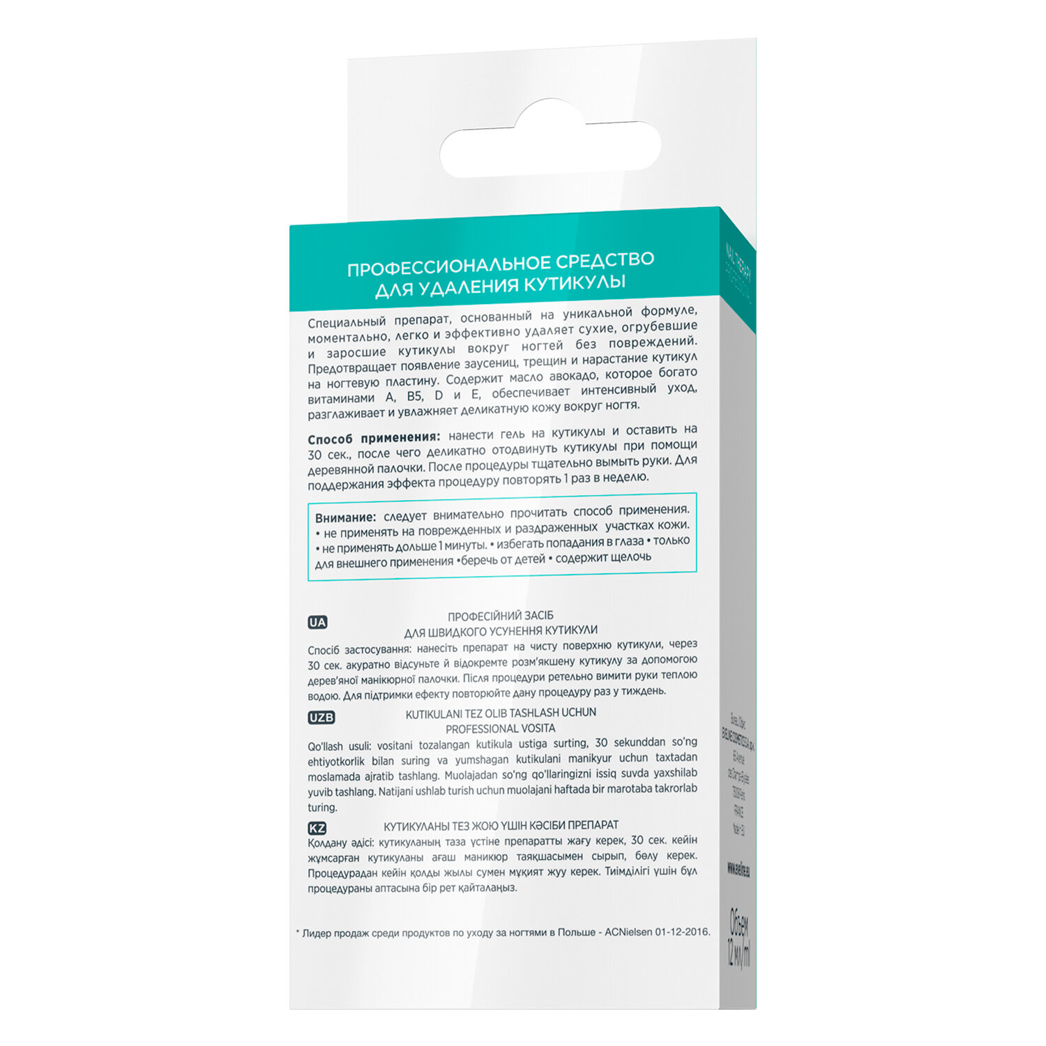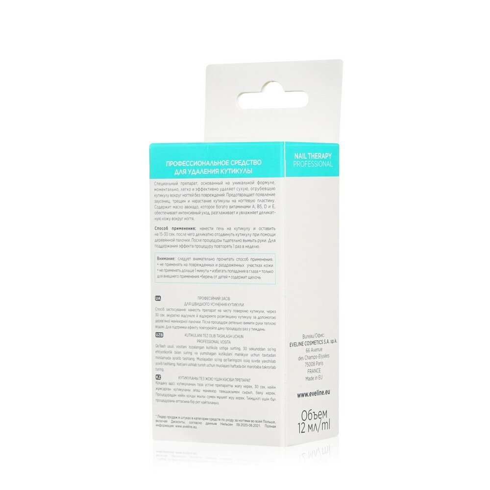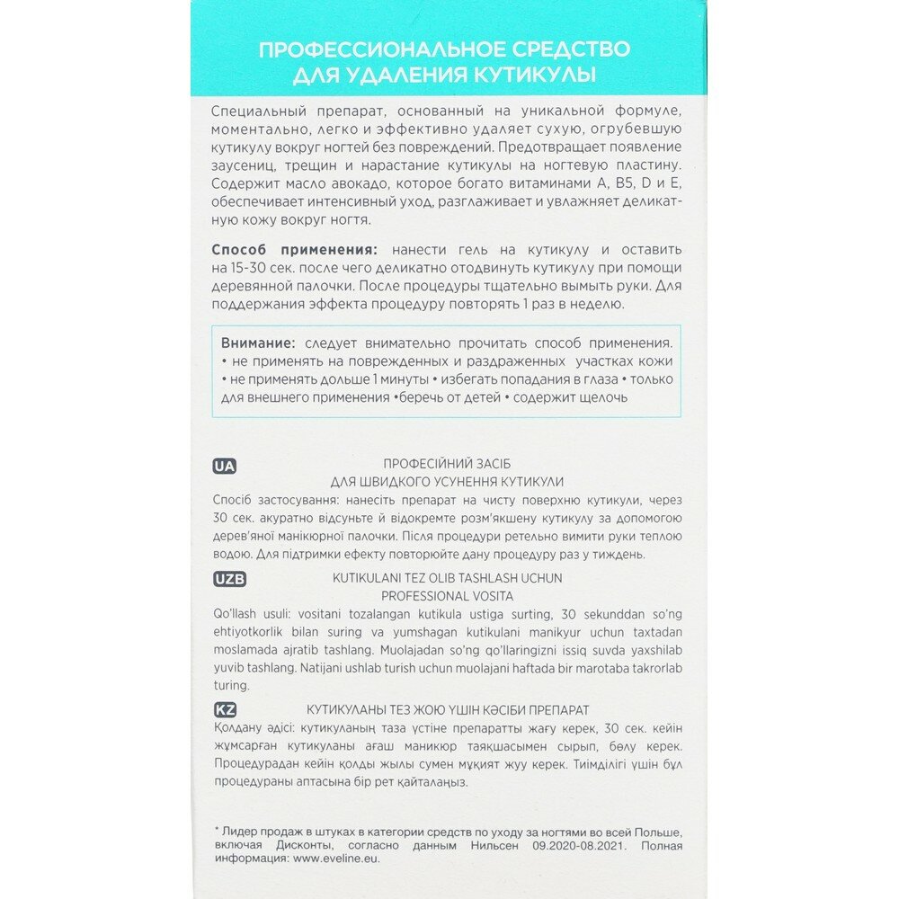 Описание товара:Удаление кутикулы – неотъемлемая часть безупречного и привлекательного маникюра. Профессиональное средство Nail Therapy от польского бренда Eveline Cosmetics предназначено для быстрого, легкого и абсолютно безопасного удаления огрубевшей кожи вокруг ногтей. Деликатная быстродействующая формула препарата основана на натуральных активных компонентах, которые позволяют удалять кутикулу без специальных инструментов, способных поранить ногтевой валик. Масло авокадо, витамины В1, В2, А, Е и С, минералы и фитостеролы способствуют укреплению и омоложению ногтевых пластин. Средство интенсивно увлажняет и питает ногти, при этом нежная кожа пальцев защищена от раздражений. Результат – мягкая кутикула и ваша полная готовность к идеальному маникюру!Состав товара:Aqua (Water), Glycerin, Potassium Hydroxide, Carbomer, Potassium Sorbate, CI 77891, Persea Gratissima Oil.Меры предосторожности:Следует внимательно прочитать способ применения. Не применять на поврежденных и раздраженных участках кожи. Не применять дольше 1 минуты. Избегать попадания в глаза. Только для внешнего применения. Беречь от детей. Содержит щелочь.Способ применения:Нанести гель на кутикулы и оставить на 30 сек, после чего деликатно отодвинуть кутикулы при помощи деревянной палочки. После процедуры тщательно вымыть руки. Для поддержания эффекта процедуру повторять 1 раз в неделю.