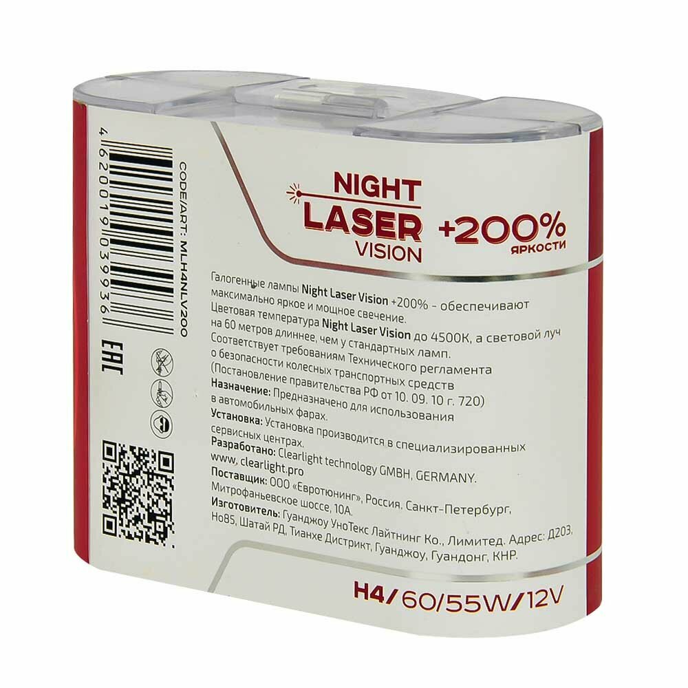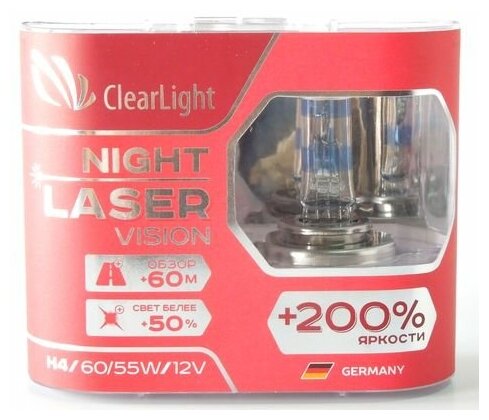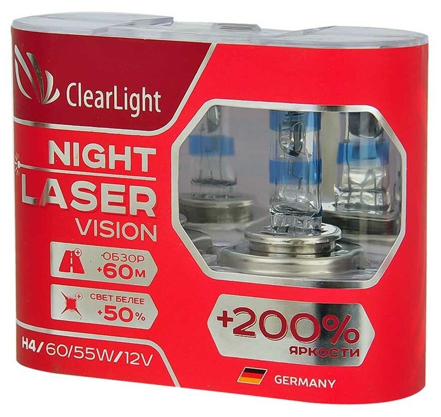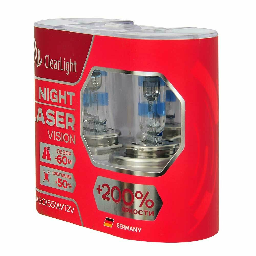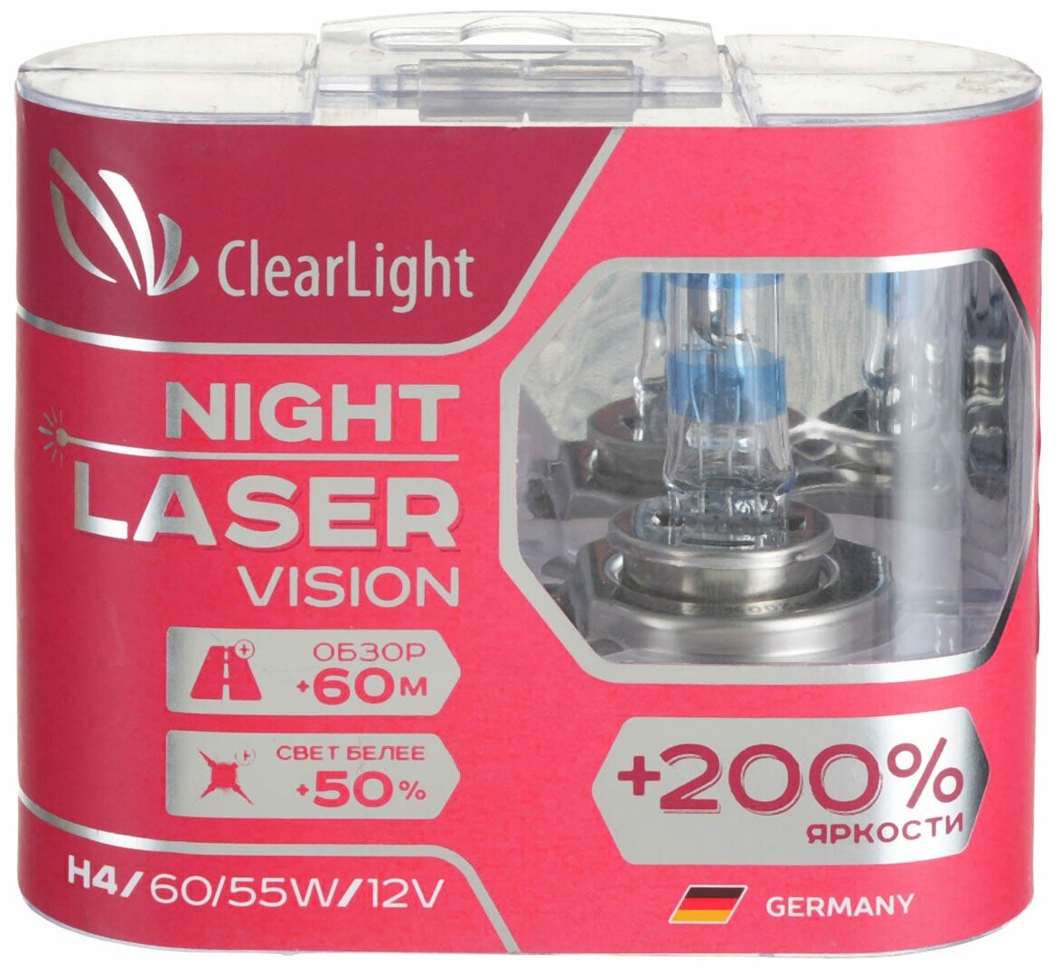 Лампа автомобильная галогенная Clearlight H4 12V-60/55W Night Laser Vision + 200%, 2 шт (MLH4NLV200)