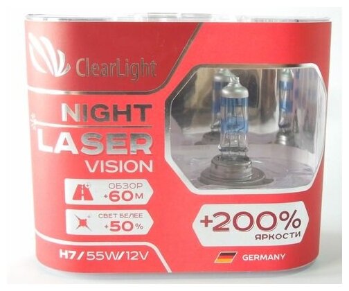 Clearlight Night Laser Vision +200% Light, пожалуй, самые яркие лампы из разрешенных для дорог общего пользования. В производстве ламп использованы лазерные технологии. Лучший срок эксплуатации в своем классе. Увеличенный обзор до 60 м. Свет белее на 50%.