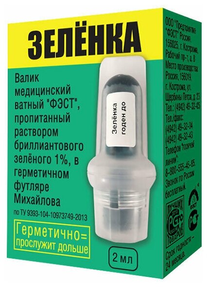 Валик медицинский ватный "фэст" пропитанный бриллиантового зеленого 1% в герметичном футляре 2мл ООО Предприятие ФЭСТ (759181)