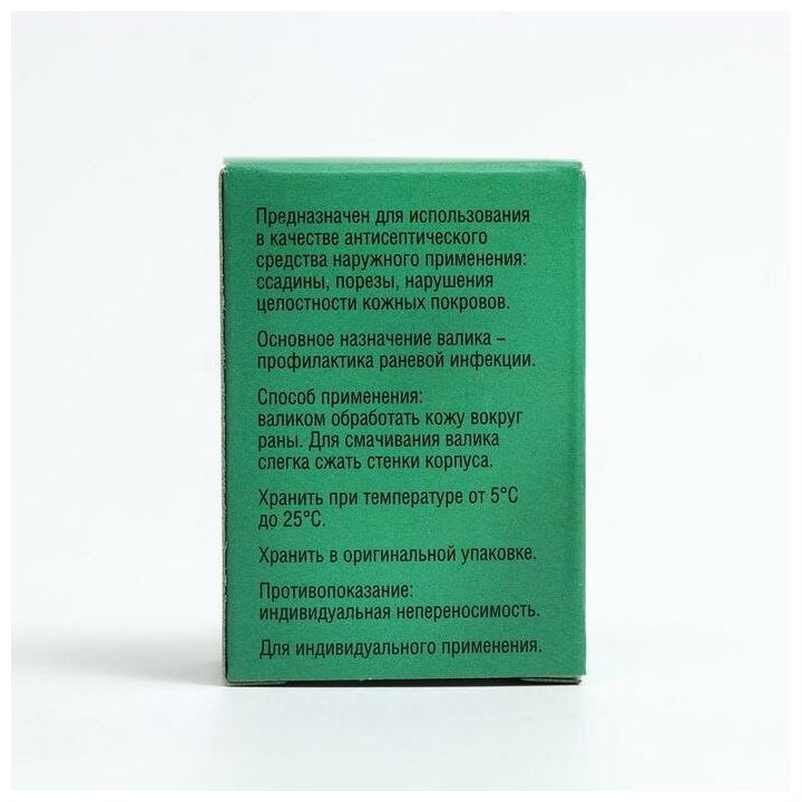 Предназначен в качестве антисептического средства наружного применения: ссадины, порезы, нарушения целостности кожных покровов. Основное назначение валика – профилактика раневой инфекции.