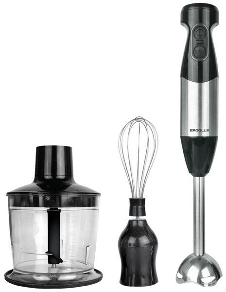 Погружной блендер Ergolux поможет в приготовлении множества блюд. Мощный 700-ваттный DC-мотор обеспечивает эффективную переработку продуктов за считаные секунды. А помогают в этом разнообразные аксессуары, которые входят в комплект поставки.широкие возможности.Погружная насадка позволит сделать суп-пюре или соус, венчик – взбить молочный коктейль, яичные белки или крем, замесить жидкое тесто, например, для кляра или блинчиков. Кроме того, вы получите чоппер объёмом 500 мл. В нём можно будет измельчить мясо, превратив его в нежный фарш, порубить овощи для рагу, зелень, сыр.
