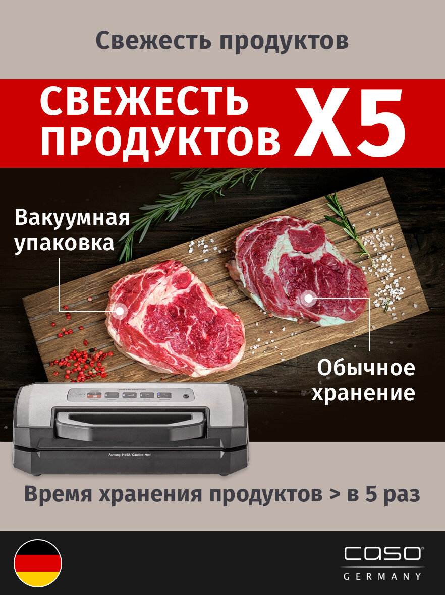 CASO – это профессиональный вакуумный упаковщик для дома со съемной камерой, пятью самыми необходимыми режимами вакуумации, включая откачивание воздуха из вакуумных контейнеров, мощным двухпоршневым насосом и увеличенной мощностью до 110 Вт.