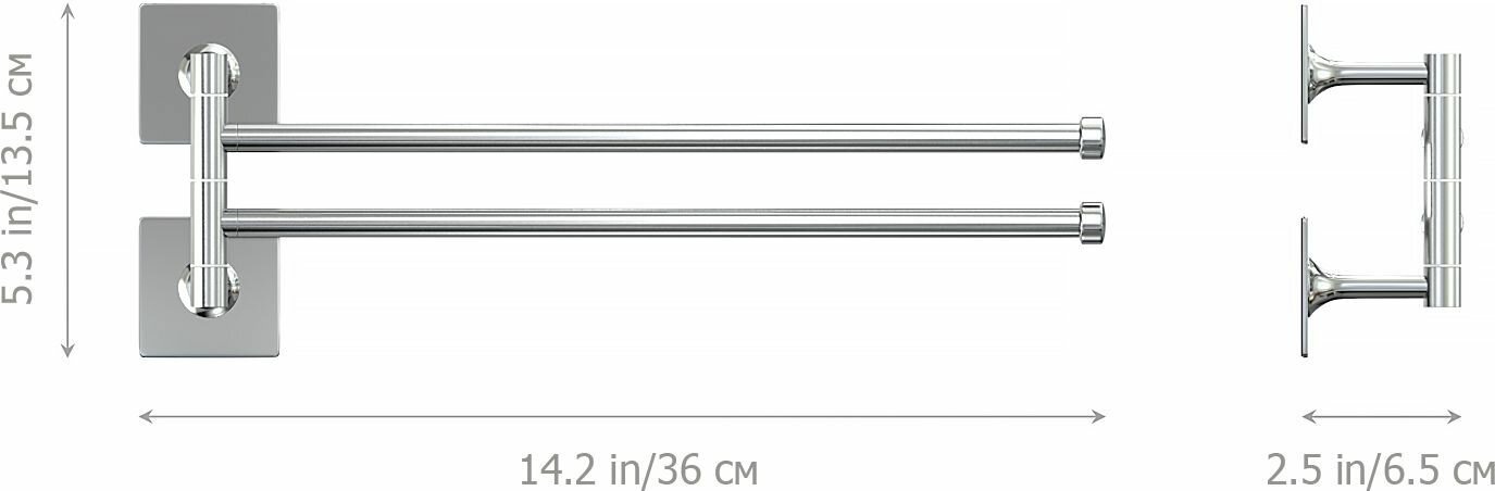 Крючки совершенно не подходят для вашей ванной? Хотите, чтобы пользоваться полотенцами было более удобно? Попробуйте установить поворотный полотенцедержатель "Kleber Expert" с двумя штангами. Вы сможете хранить полотенца в расправленном виде и размещать их на любом расстоянии, раздвигая штанги. Вы сами выбираете угол поворота, чтобы наиболее комфортно использовать пространство в ванной. Крепление к любой вертикальной поверхности осуществляется при помощи силиконовых оснований, которые надежно удерживают вес до 16 кг! А элегантный цвет хромированного металла сделает интерьер более стильным. Для создания стильного интерьера дополните другими товарами из серии "Kleber Expert".