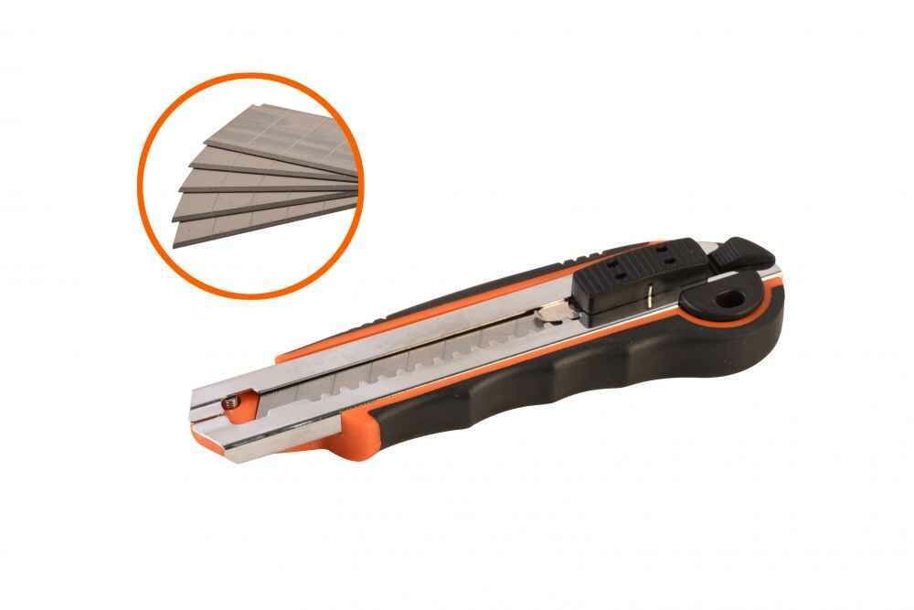 Нож используется для разрезания ткани, бумаги, картона, проводов, а так же более плотных материалов ( линолеума, гипсокартона и т.д.) Ручка позволяет хранить в ней сменные лезвия для того, чтобы они были всегда под рукой для оперативной замены. Автоматическая подача в разы ускоряет смену отработанных лезвий и позволяет быстро вернуться к работе. Обрезиненная рукоятка обеспечивает полный контроль инструмента. Металлическая направляющая исключает случайный слом лезвия. Дополнительный винтовой фиксатор лезвия на конце направляющей поможет легче работать с особо плотными материалами.