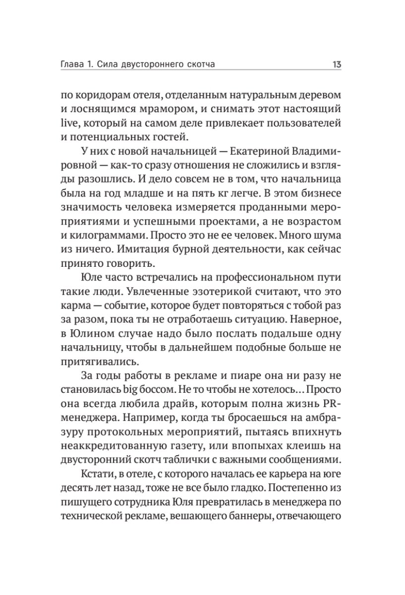 ¦Хронологический беспредел. Истории Юлианы не привязаны к датам. На 10-й странице она маркетолог в отеле, на 70-й её приобнимает Авербух со словами «Спасибо, Юля!», на 106-й самодостаточная и уверенная в себе восьмилетняя женщина в костюме свиньи бреет зайца, а на 110-й она уже продаёт свой настоящий «мерседес», чтобы полететь в Америку… И в этом кубике Рубика десятки PR-инструментов, которыми Юля овладела когда-то и владеет сейчас. Неважно, было это 10 лет назад или в прошлом году. Если когда-то она узнала, что двусторонний скотч спасает в самых разных ситуациях, то почему бы не держать его под рукой сейчас?