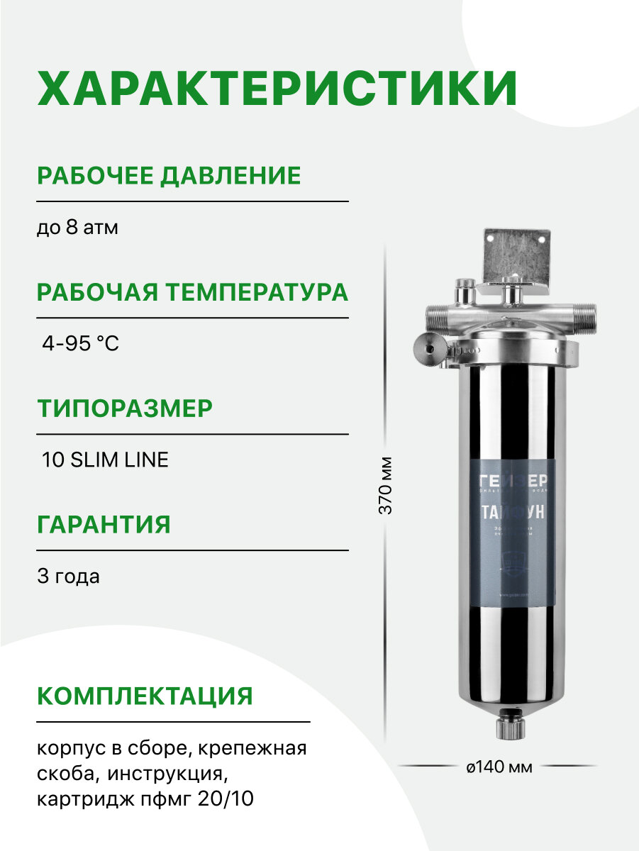 Фильтр Тайфун 10SL 3/4" производителя Гейзер отвечает всем установленным на данный момент международным стандартам качества обработки воды и производительности. Предназначено изделие для очистки преимущественно горячей воды от нерастворенных примесей, а также способен значительно улучшить показатель цвета воды. Фильтр Тайфун 10SL 3/4" разработан для простого и комфортного подключения к водопроводной магистрали в домах, небольших офисах, коттеджах и квартирах, а также легок в замене сменного картриджа.