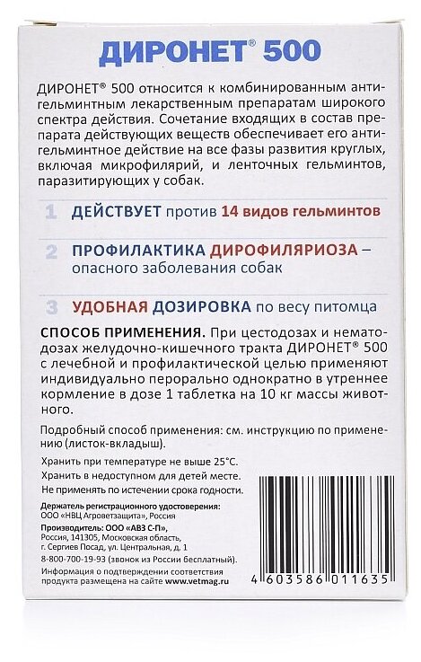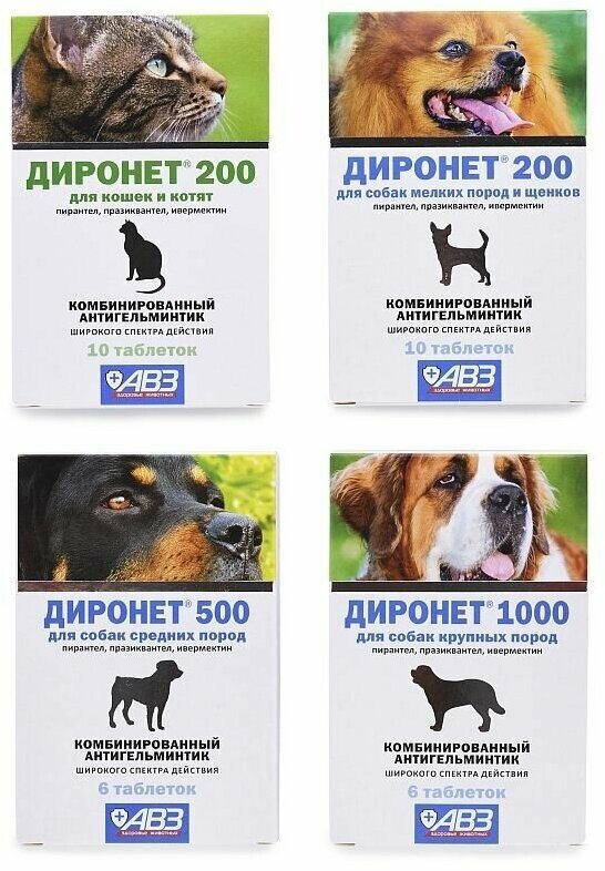 Диронет® 500 таблетки для собак средних пород в качестве действующих веществ в 1 таблетке содержат пирантела памоат – 150 мг, празиквантел – 50 мг и ивермектин – 0,06 мг, а также вспомогательные вещества. «Диронет таблетки» предназначены для собак.