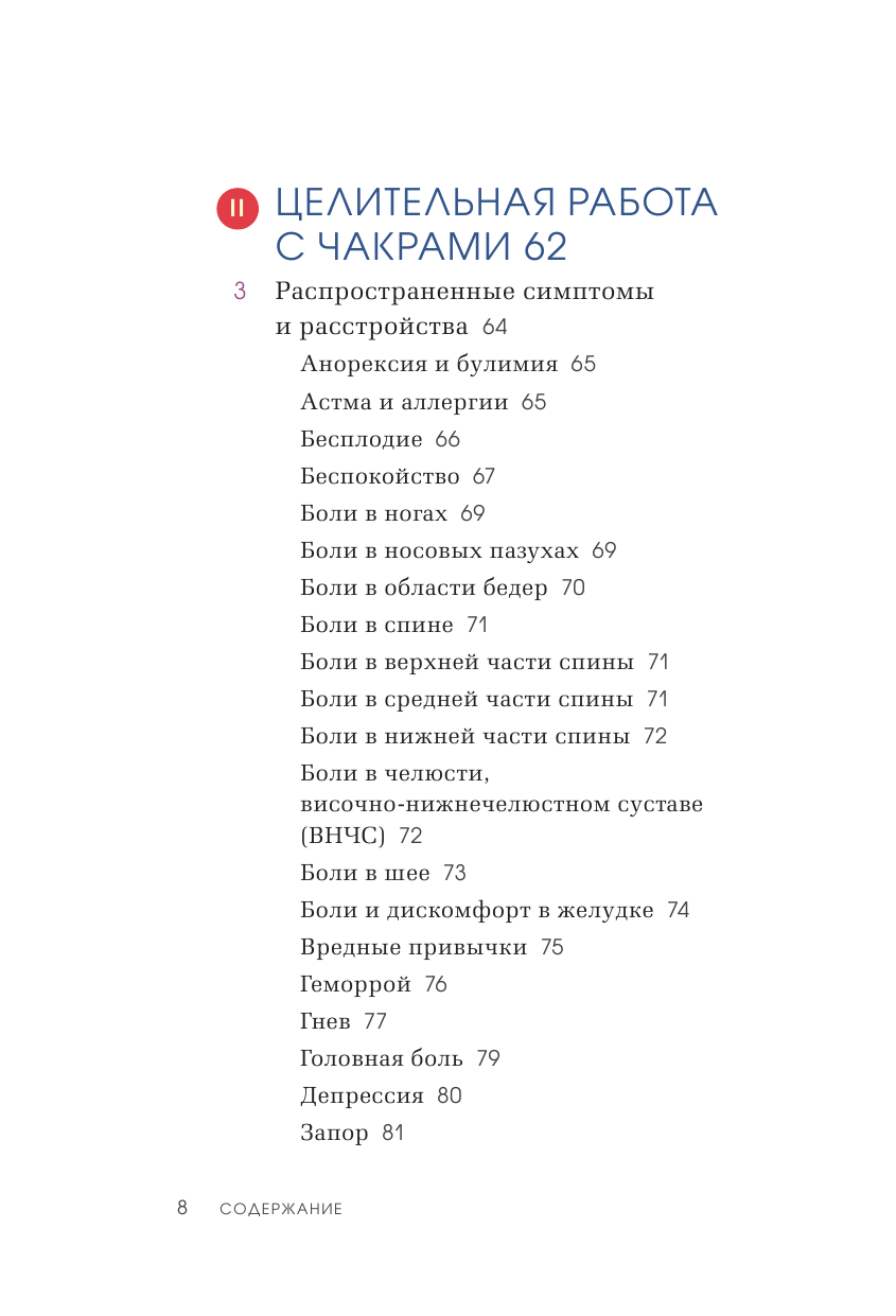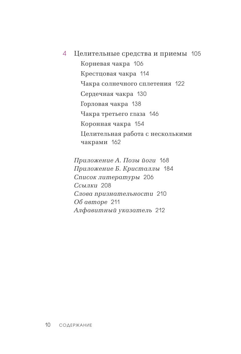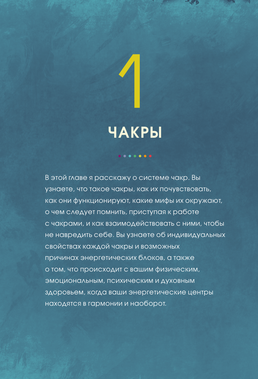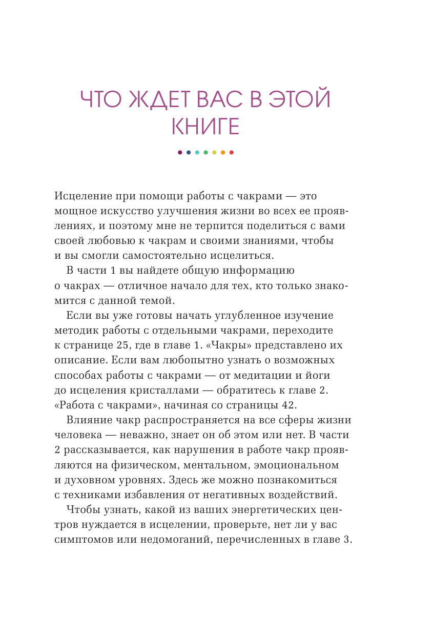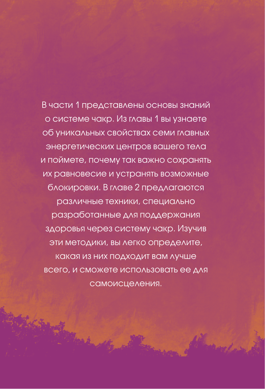 Книга включает простые и понятные даже начинающим пошаговые рекомендации по балансировке чакральной системы, включающие медитации и визуализации, кристаллотерапию, использование эфирных масел, занятия йогой, коррекцию питания и диеты, рекомендации по работе с поведенческими паттернами и многое другое.