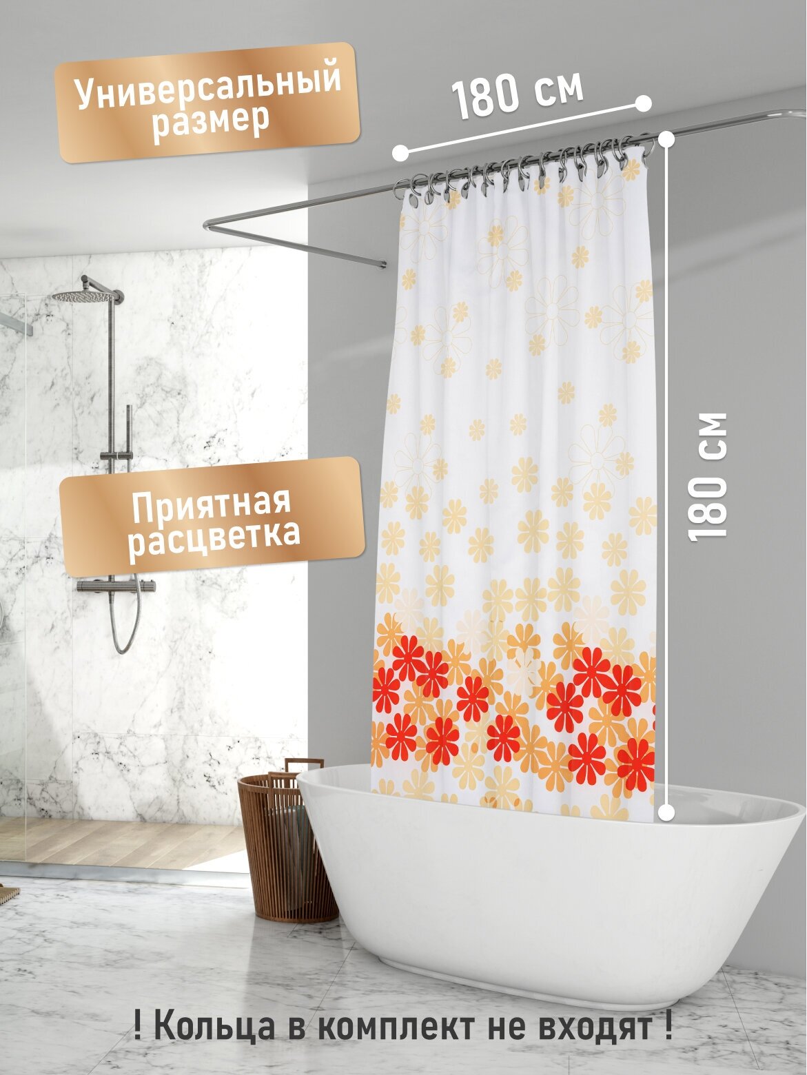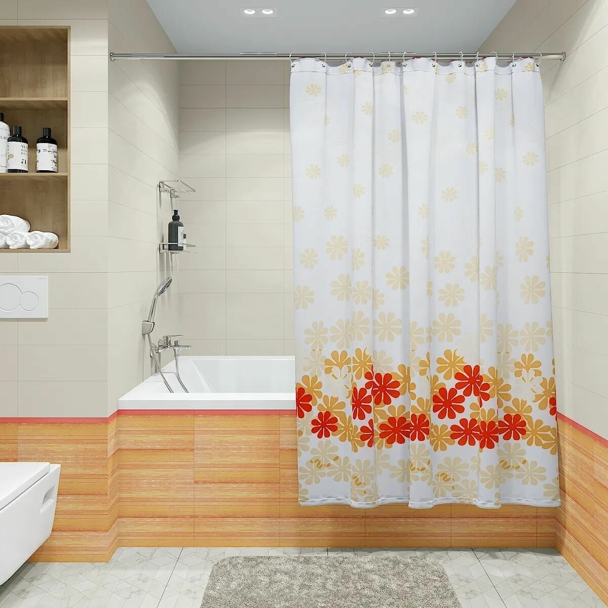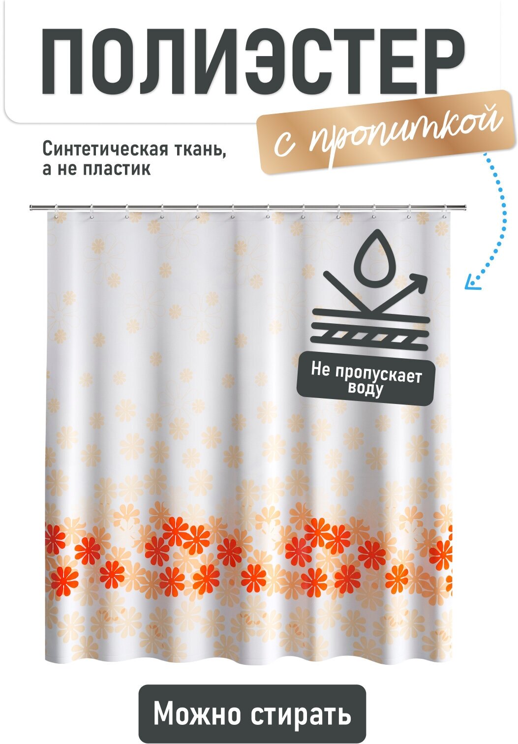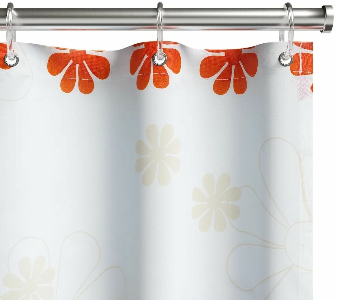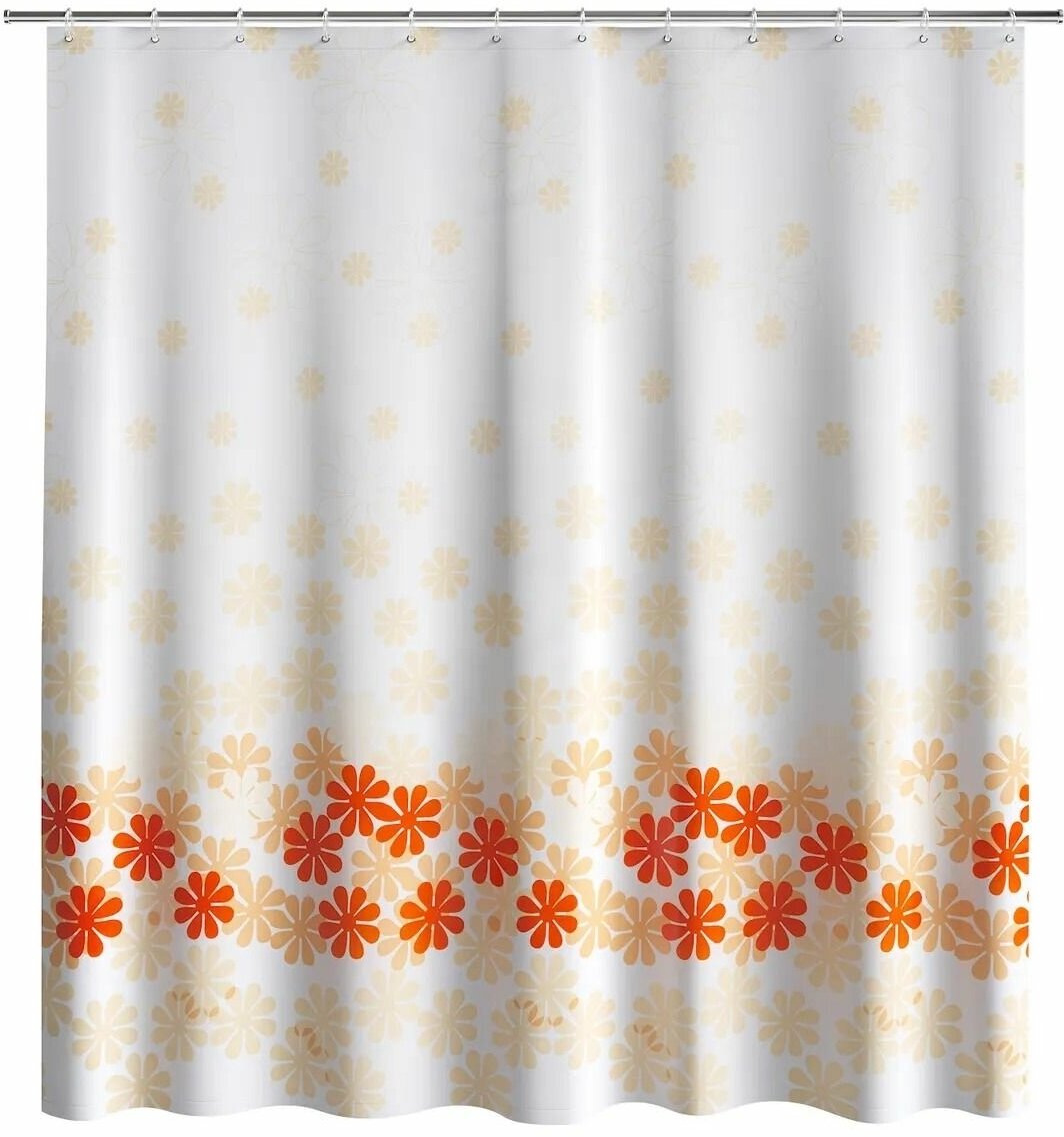Шторка для ванной "Цветочный дождь", оранжевая. Шторка 100% полиэстер с влагостойкой пропиткой. В комплект входит 12 колец для штор.