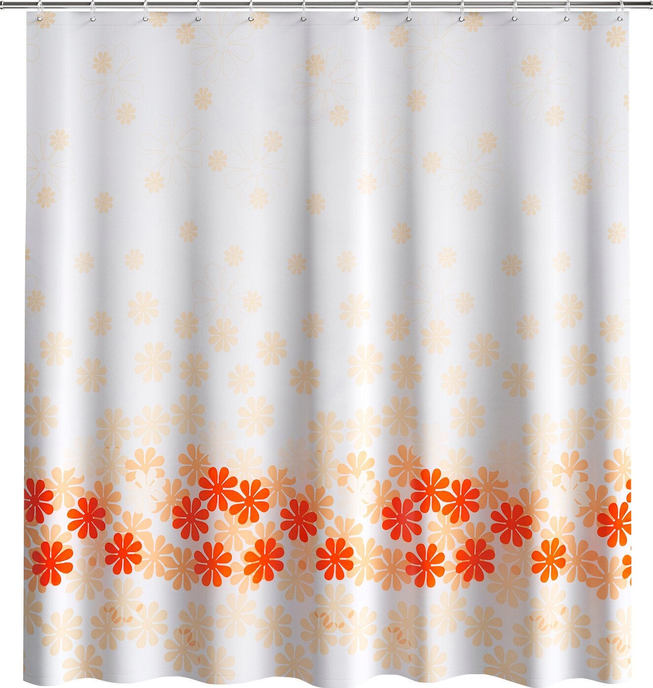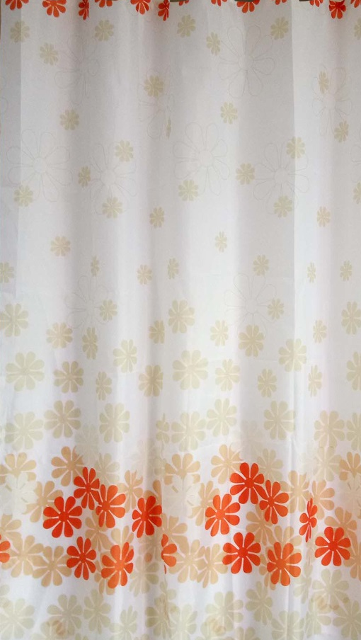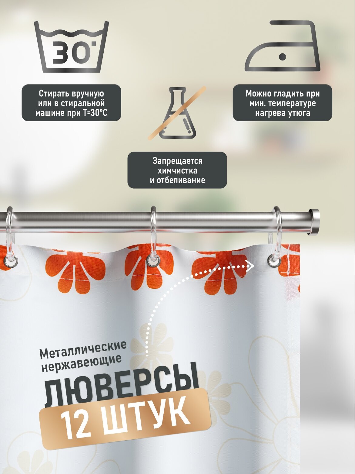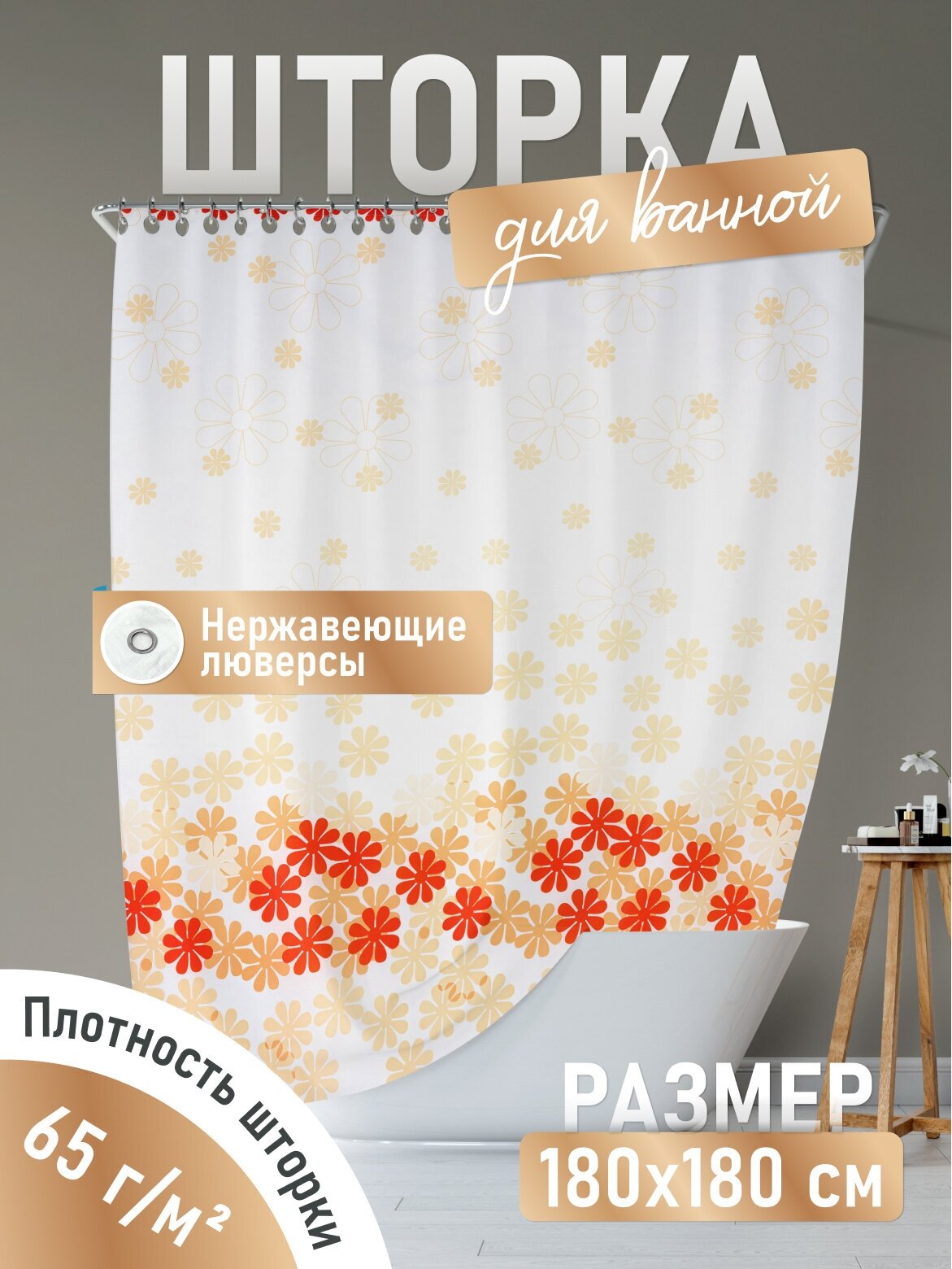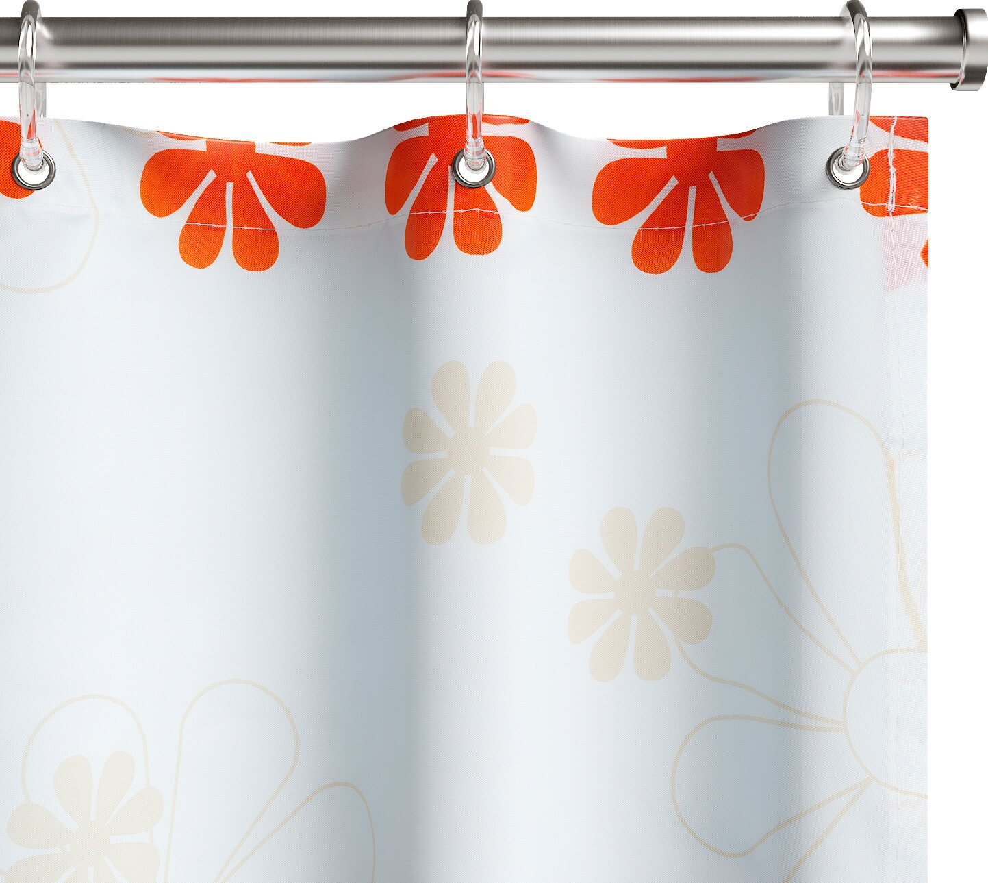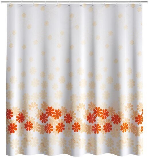 Шторка для ванной "Цветочный дождь", оранжевая. Шторка 100% полиэстер с влагостойкой пропиткой. В комплект входит 12 колец для штор.