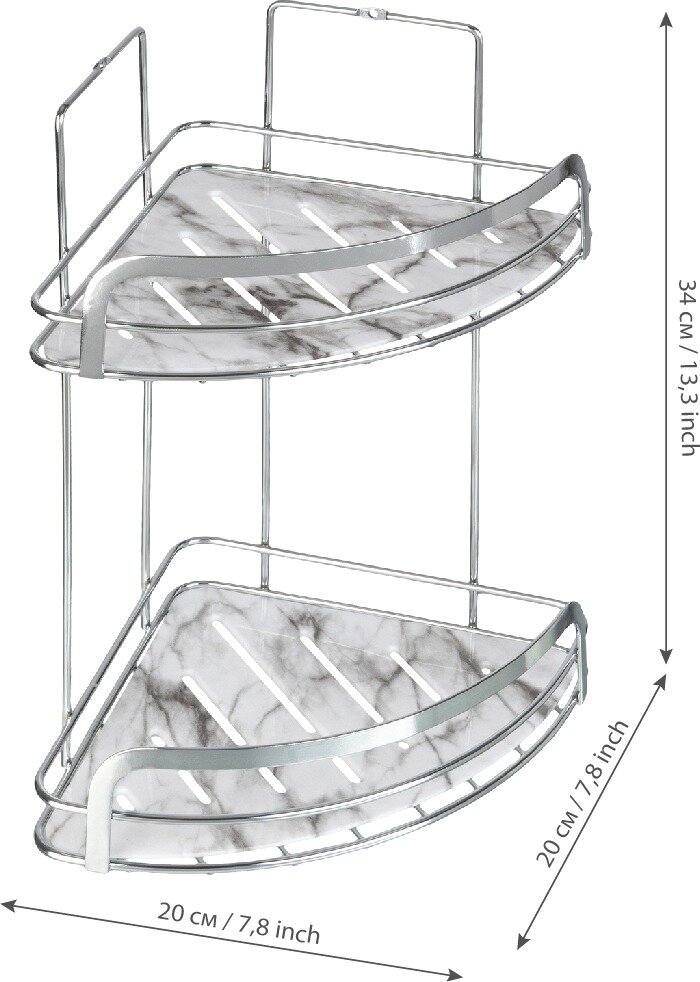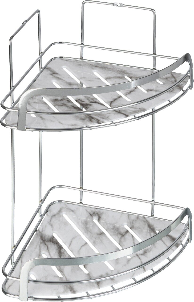 Полка-корзина Fora Marble FOR-MAR02-U двойная, угловая - изделие изготовлено из хромированного железа, устойчивого к появлению коррозии, и имеет пластиковую вставку, имитирующую мрамор. Вставку можно снять, что облегчает уход за изделием.