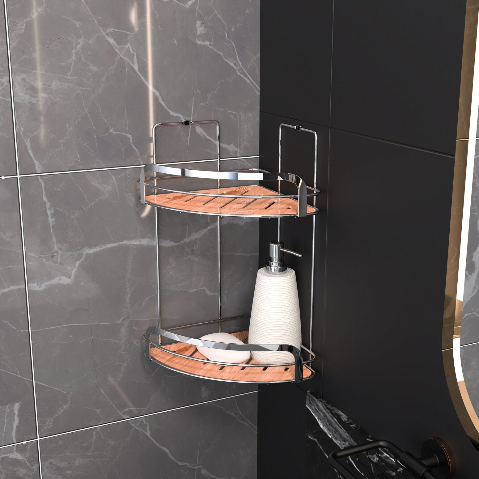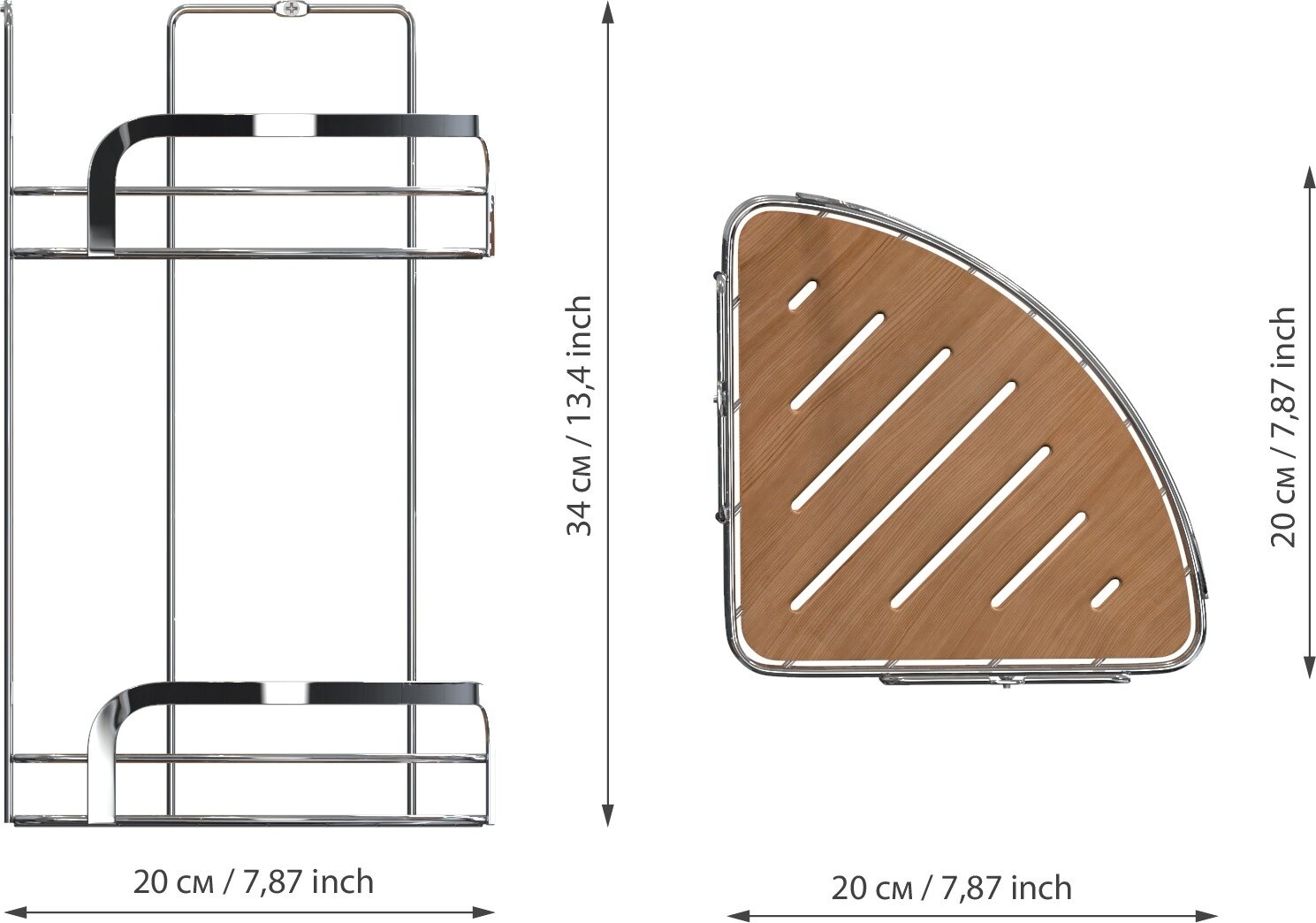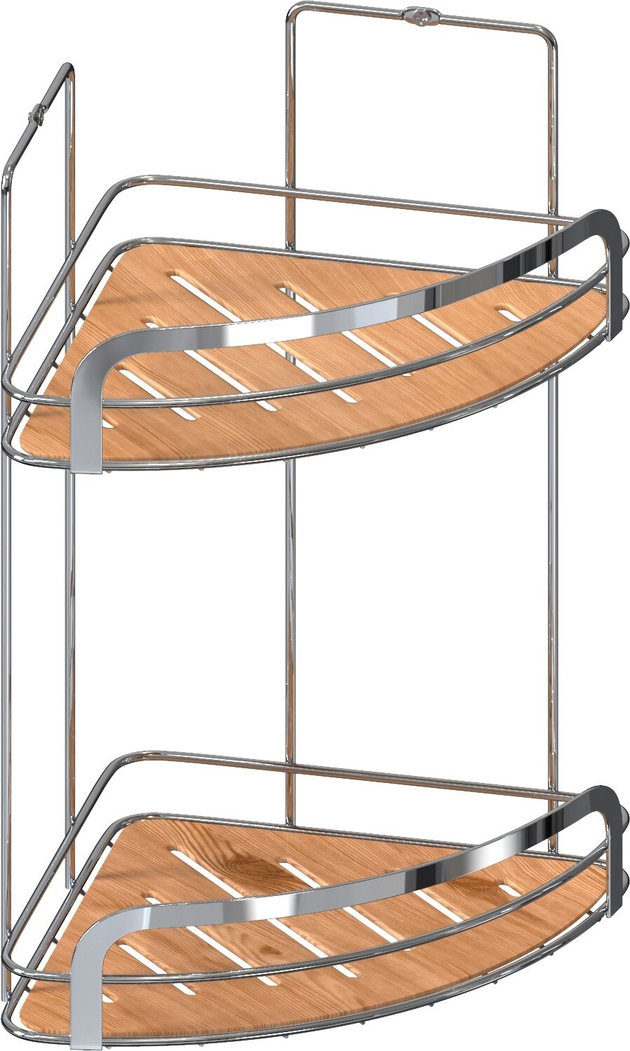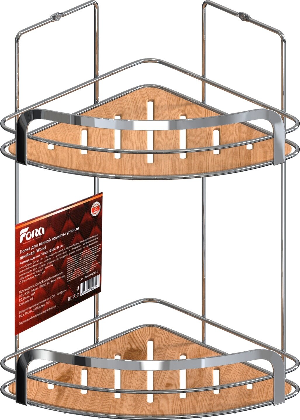 Полка-корзина Fora Wood FOR-WOD02-U двойная, угловая - изделие изготовлено из хромированного железа, устойчивого к появлению коррозии, и имеет пластиковую вставку, имитирующую дерево. Вставку можно снять, что облегчает уход за изделием.