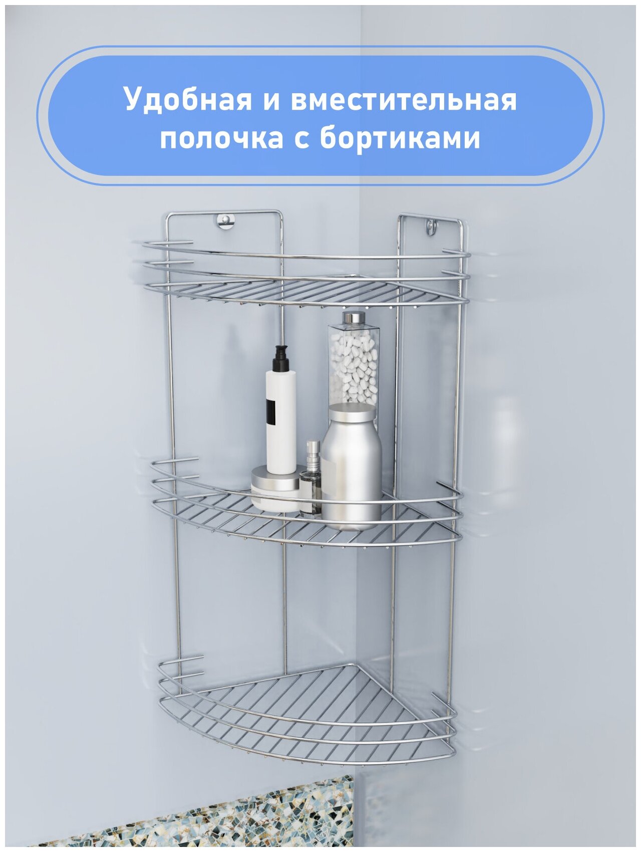 Тройная угловая решетчатая полочка выполнена из хромированного железа, устойчивого к воздействию высоких температур и влажности. Аксессуар надежно фиксируется на угол стены, а металлические бортики предотвращают падение банных принадлежностей. Решетчатая конструкция полки легко моется и позволяет поддерживать чистоту ванной комнаты.