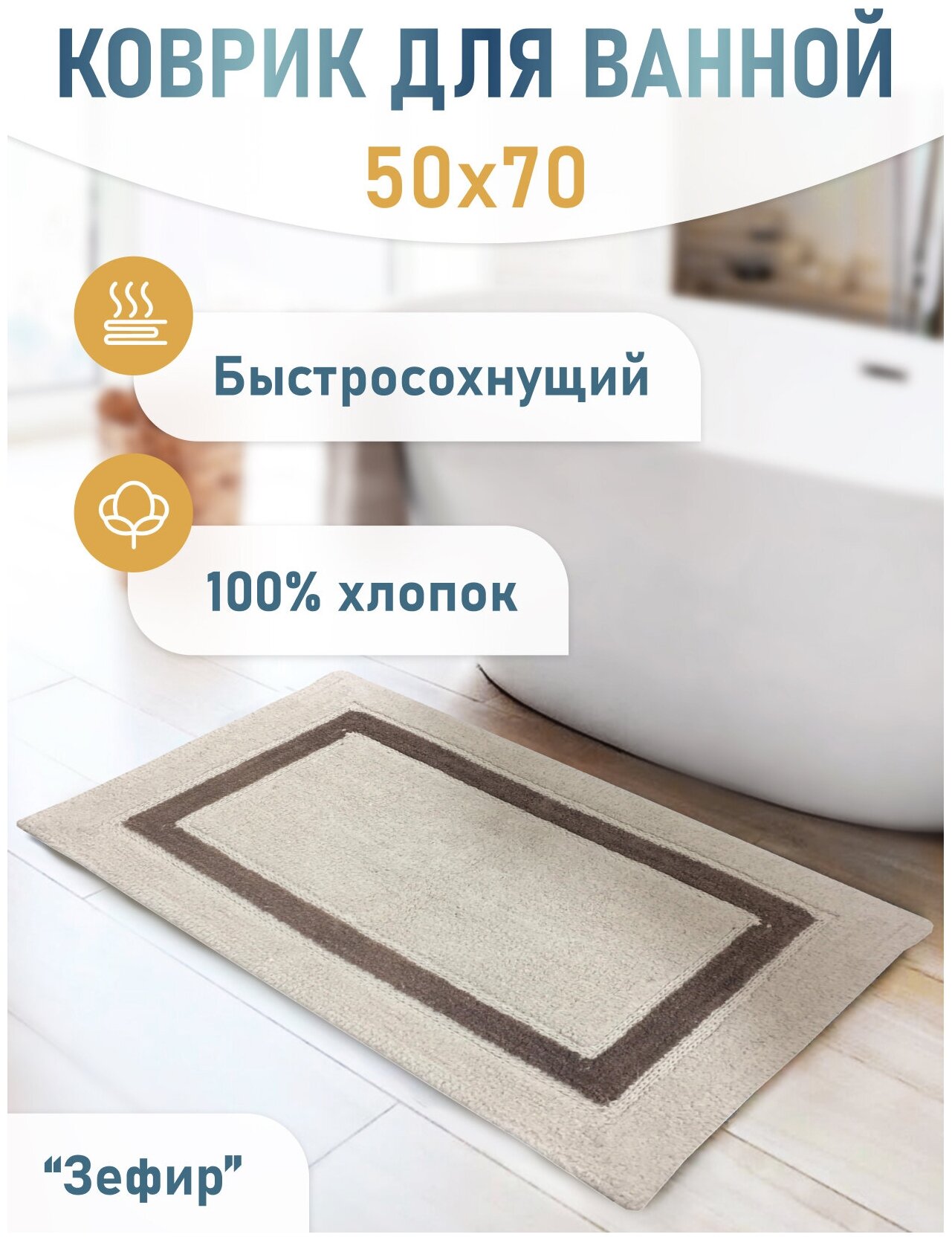 Одинарный коврик для ванной "Классика" цвета зефир 50*70cm из экологически чистого 100% биохлопка. Мягкий и приятный на ощупь, быстро впитывает влагу. Коврик антибактериальный, неаллергенный, неэлектризуется.