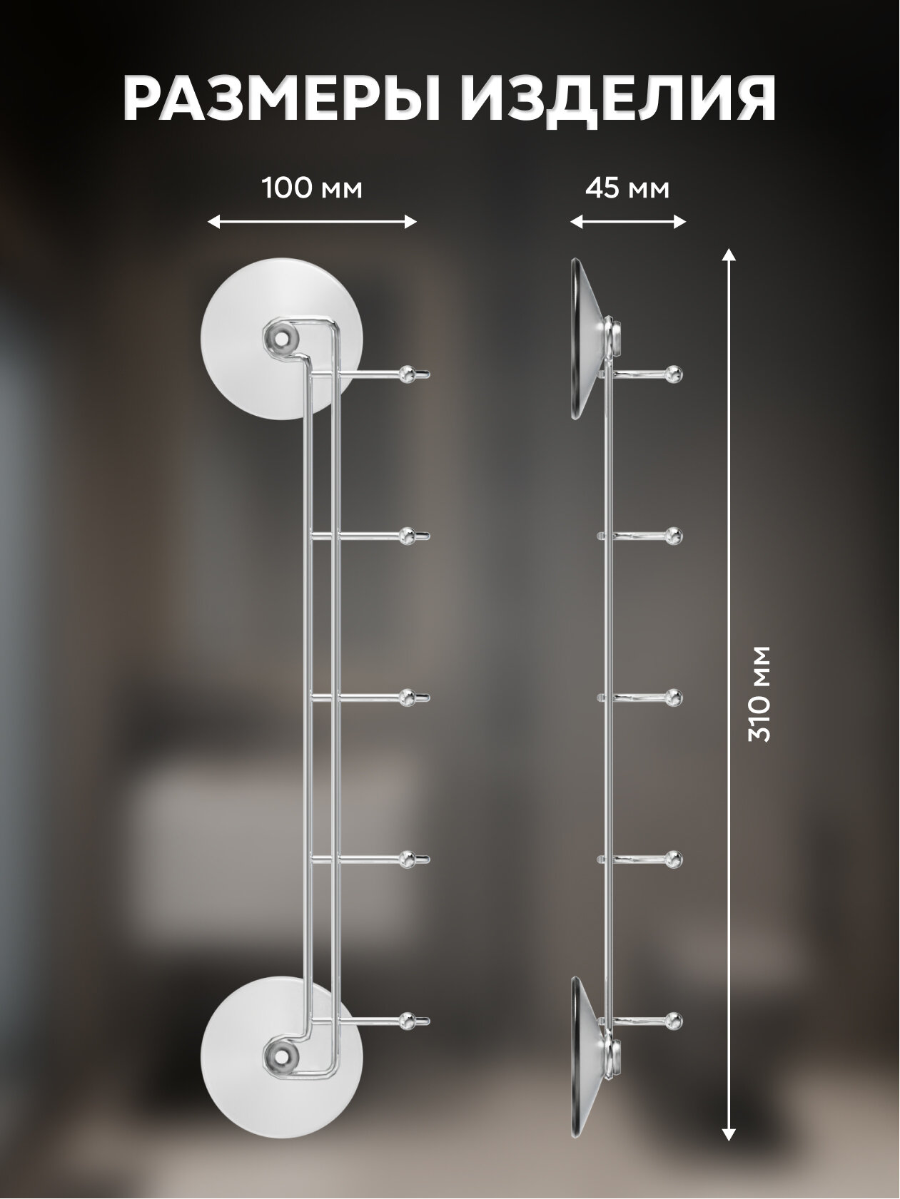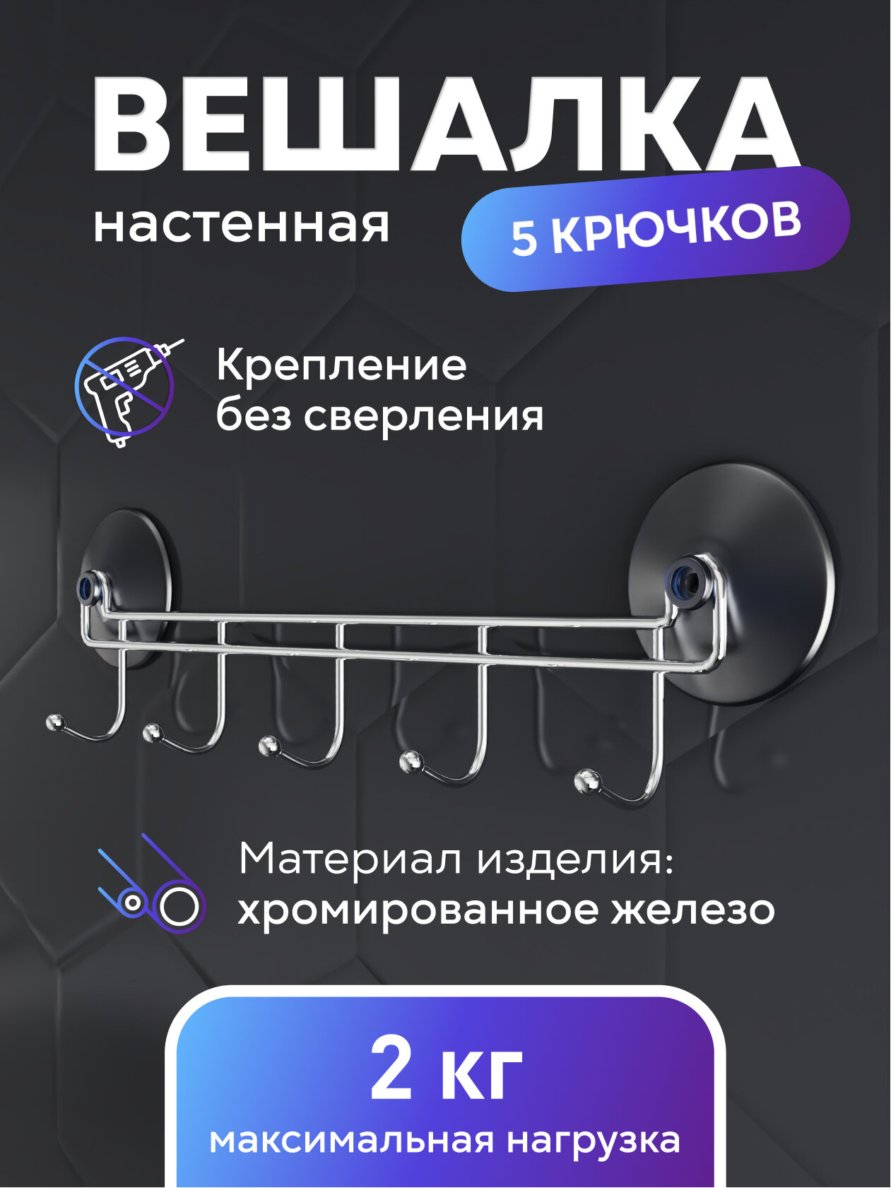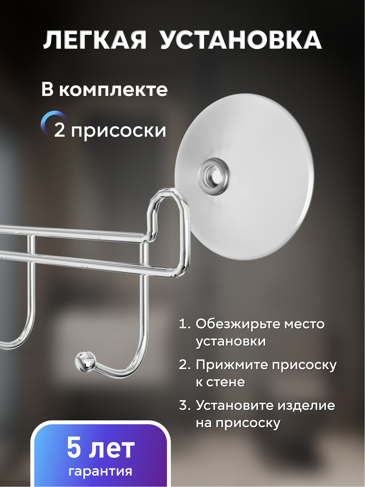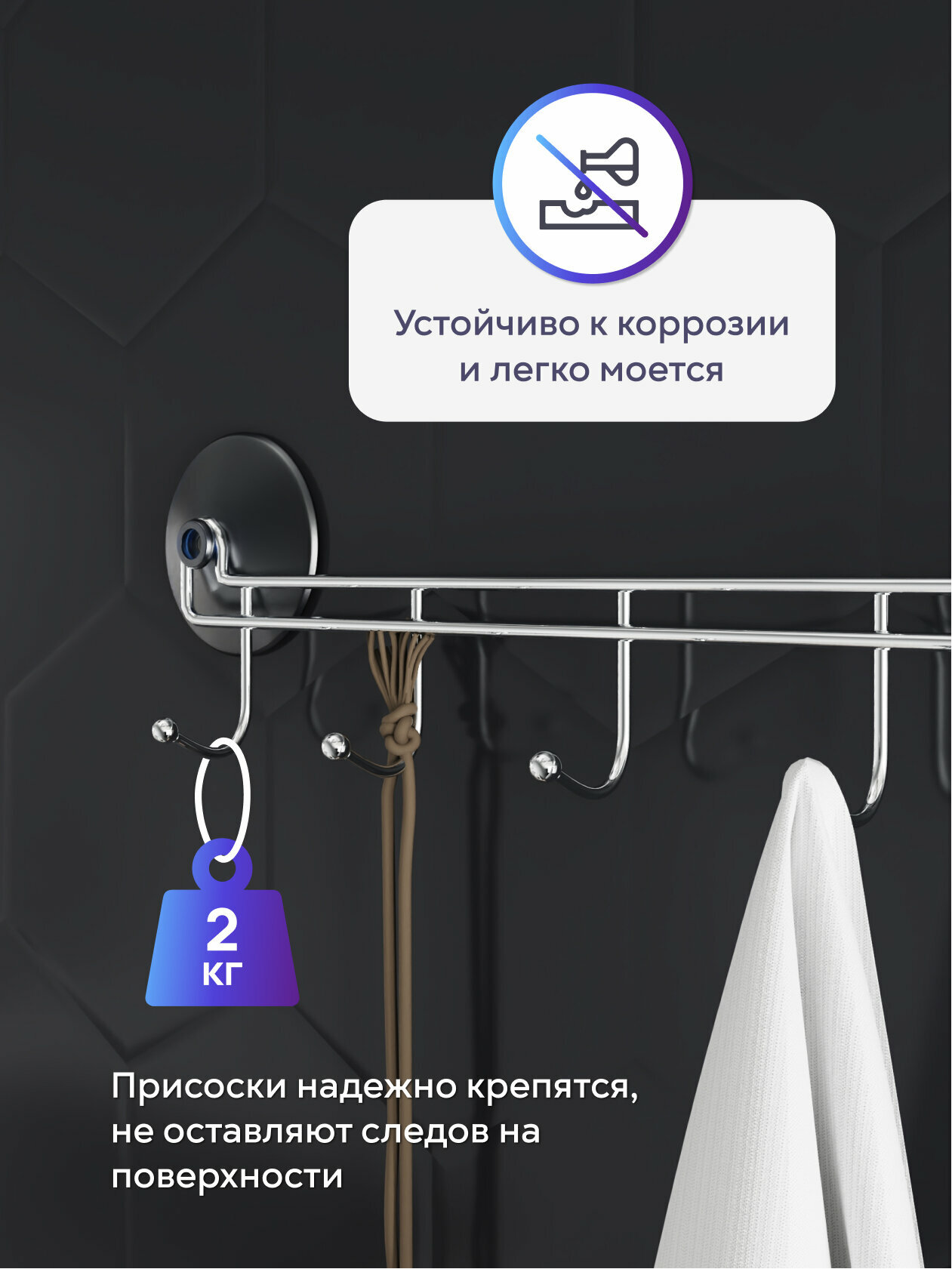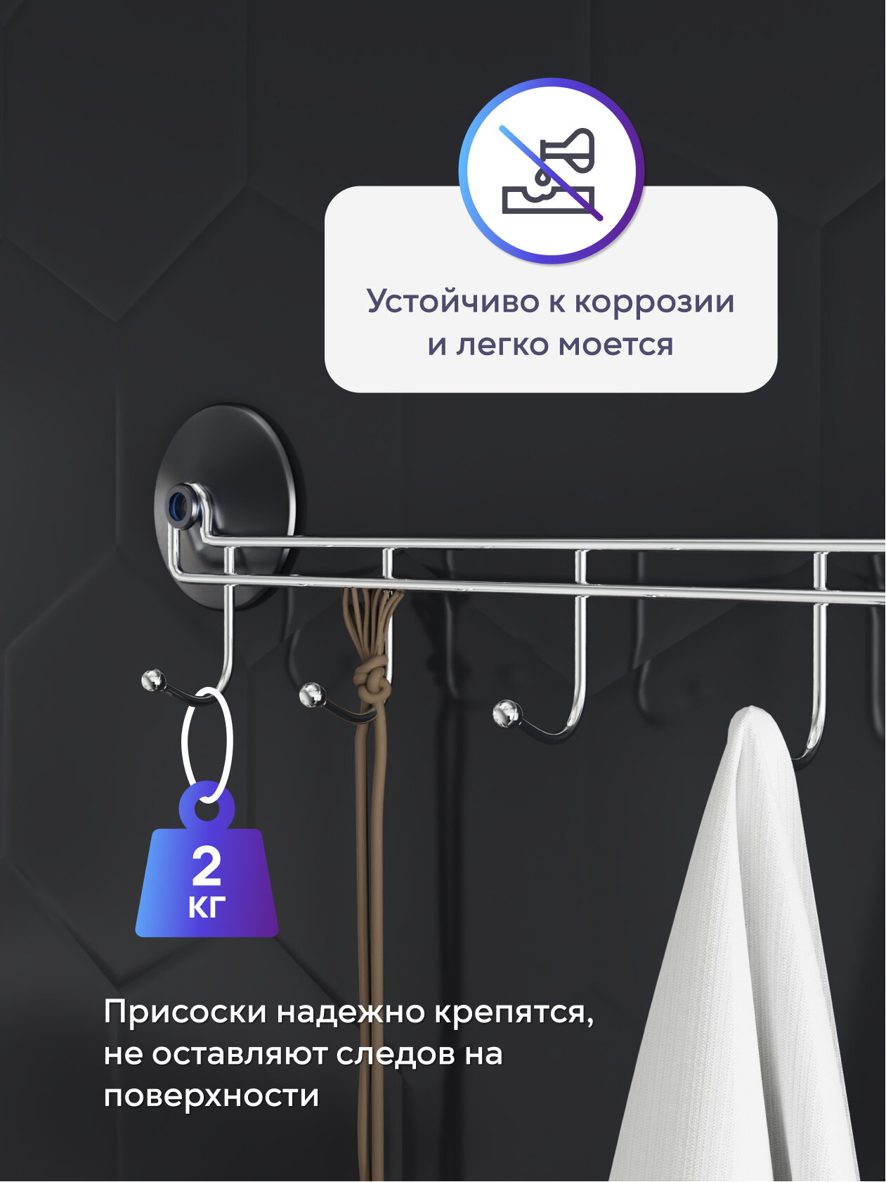 Вешалка с 5-ю крючками на 2 присосках Данное изделие крепится с использованием нанотехнологичной клейкой ленты . Вам не нужно сверлить стену! Удалите защитную пленку с задней стороны изделия, обезжирить и очистите место установки, прижмите изделие кстене. Крепление гарантированно выдерживает до 8 кг. Продукция бренда сделает вашу ванную комнату красивой и функциональной.
