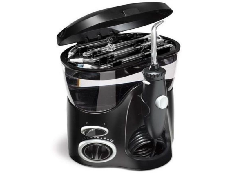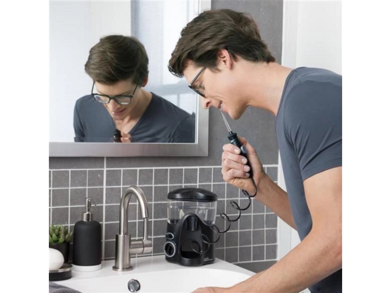 Стационарная модель с кнопкой на ручке для остановки струи воды и встроенным в крышку хранилищем для дополнительных насадок. До 50% более эффективен, чем традиционная зубная нить. Усовершенствованная система контроля давления с 10 уровнями. Резервуар на 600 мл.